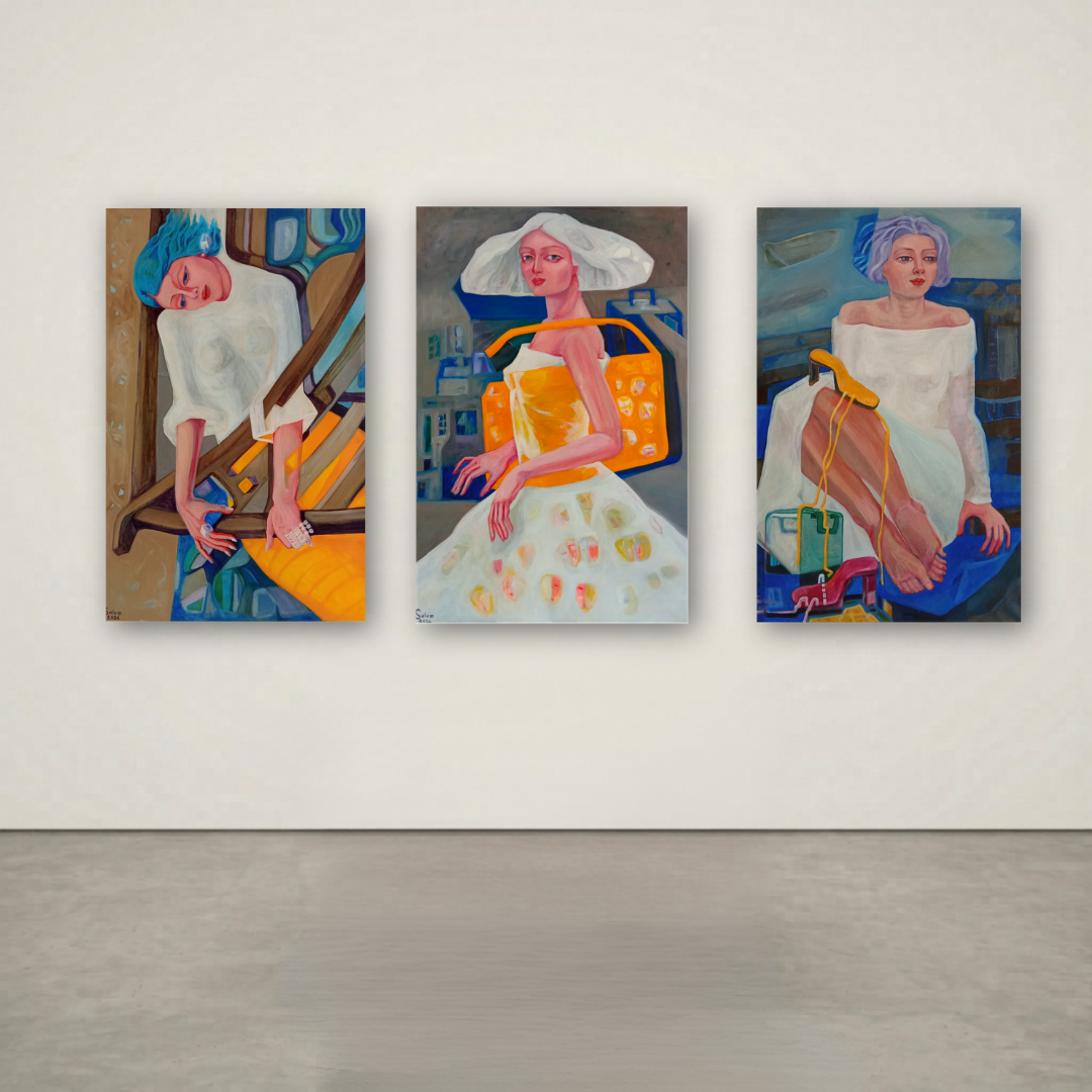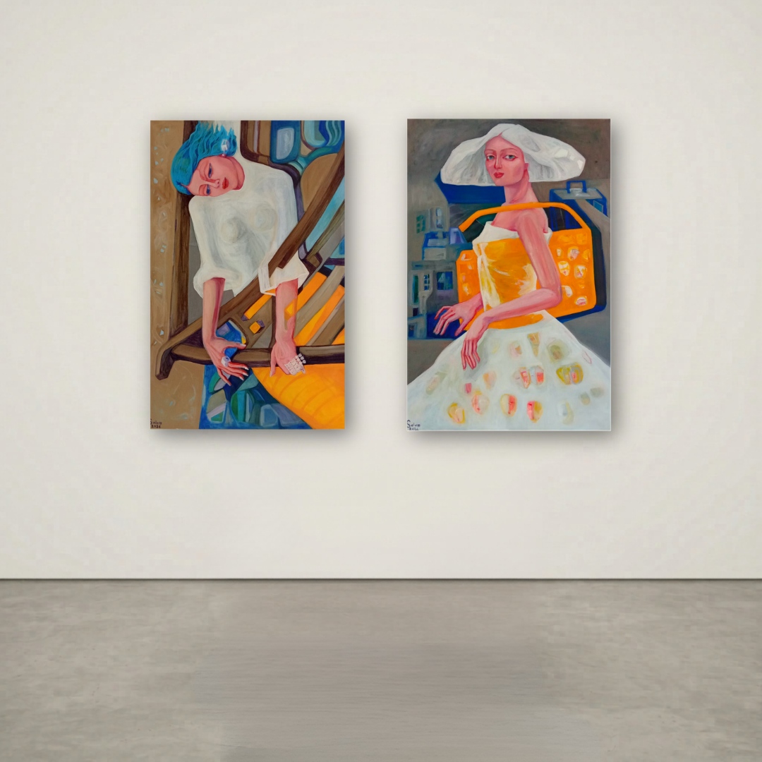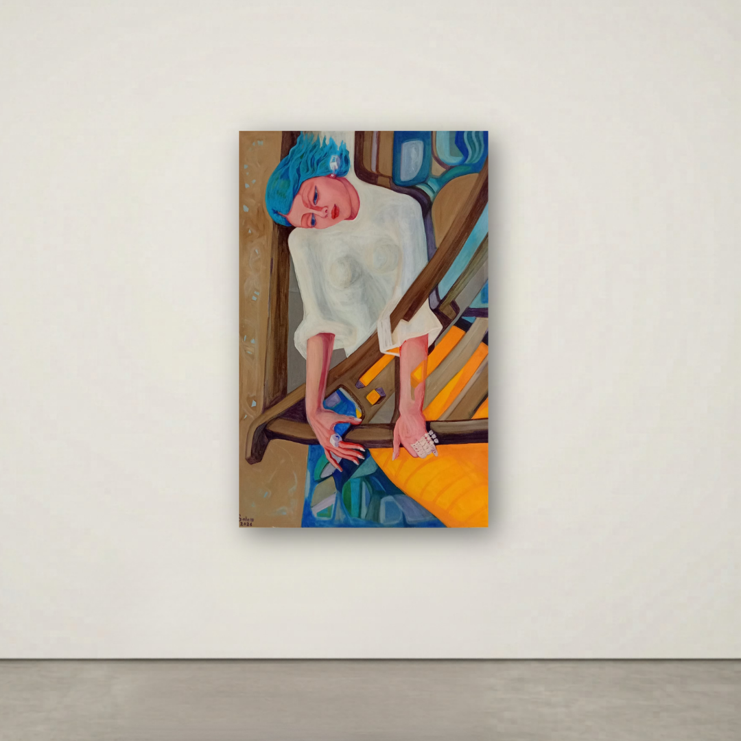 This work explores a state of emotional suspension, where the figure appears both present and drifting. The body is elongated and gently distorted, creating a sense of fluidity rather than physical weight.