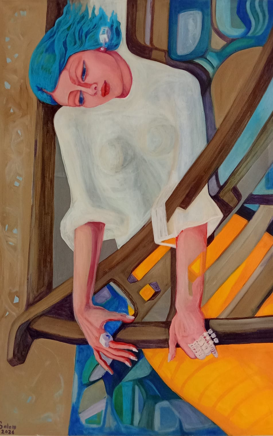 Salam Ahmad, trained in Fine Arts in Syria, works through painting as an intimate, emotional language. Her compositions emerge from quiet inner spaces, where feelings take form before they are spoken. The body dissolves into sensation, and color, especially grey, becomes a field of reflection, suspended between presence and absence, fullness and emptiness.