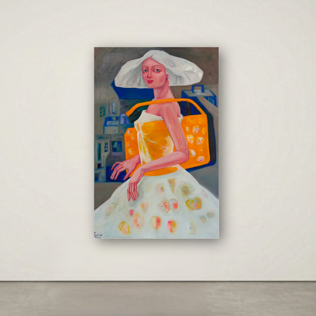 This work presents the figure as both carrier and container, where the body becomes a vessel for stored experiences. The composition balances stillness with quiet tension, as objects merge into the figure rather than surrounding it.