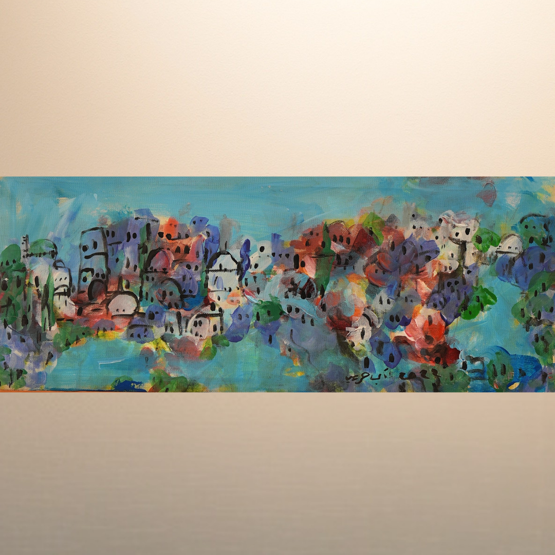 “A View from the Sky” by Etab Hreib is a pair of acrylic on canvas works that reimagine the landscape as memory seen from above fluid, shifting, alive. Clusters of small houses scatter across rolling color fields, their soft shapes and rhythmic brushwork echoing the pulse of life beneath them. From this aerial gaze, the world feels both intimate and infinite, a tapestry of human presence woven into the earth itself. The cool blues and greens hold serenity, while the bursts of red and yellow suggest movement, growth, and the persistence of life even after change. Hreib paints not geography, but emotion, how a place feels when remembered, how home lingers long after distance.