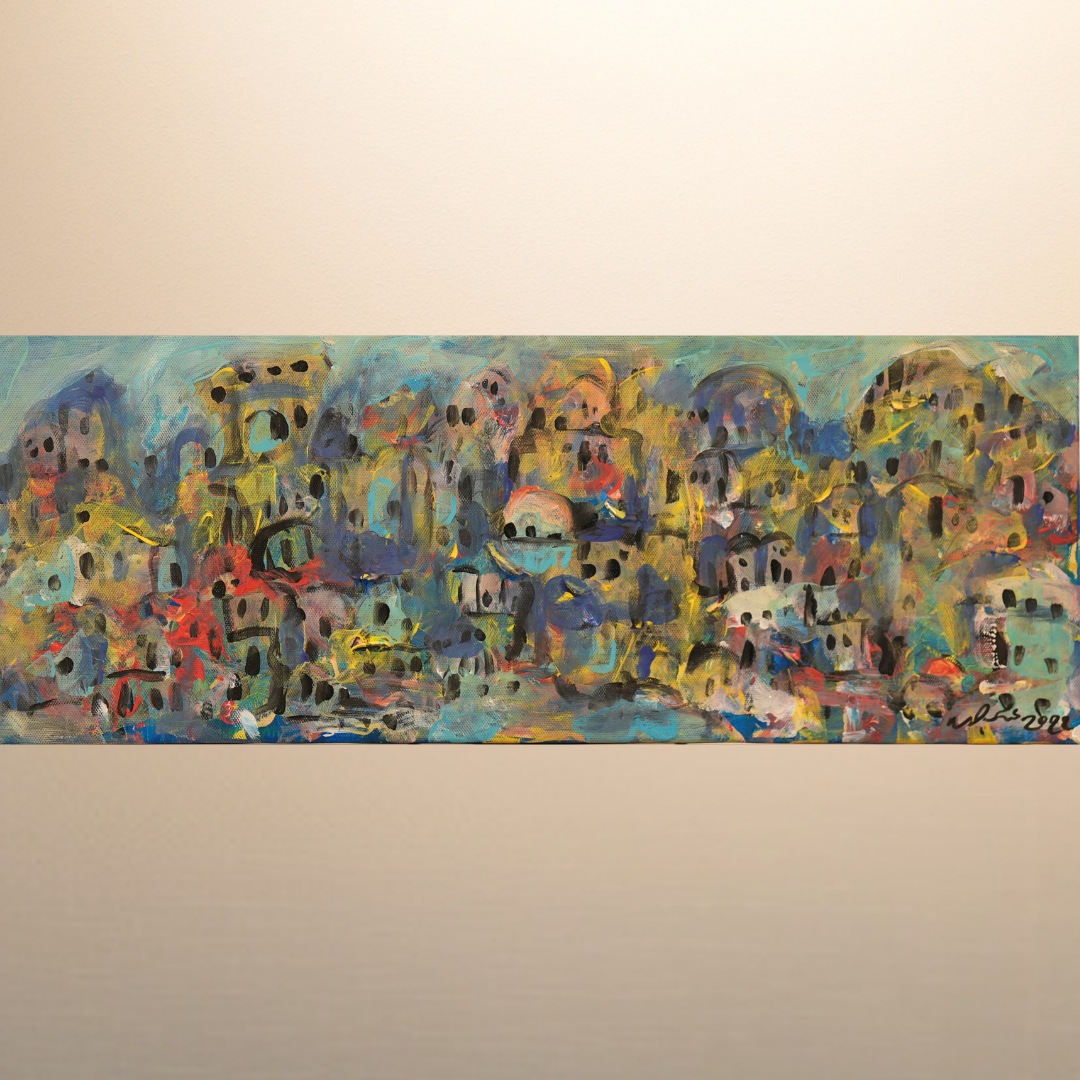 “A View from the Sky” by Etab Hreib is a pair of acrylic on canvas works that reimagine the landscape as memory seen from above fluid, shifting, alive. Clusters of small houses scatter across rolling color fields, their soft shapes and rhythmic brushwork echoing the pulse of life beneath them. From this aerial gaze, the world feels both intimate and infinite a tapestry of human presence woven into the earth itself. The cool blues and greens hold serenity, while the bursts of red and yellow suggest movement, growth, and the persistence of life even after change. Hreib paints not geography, but emotion — how a place feels when remembered, how home lingers long after distance.