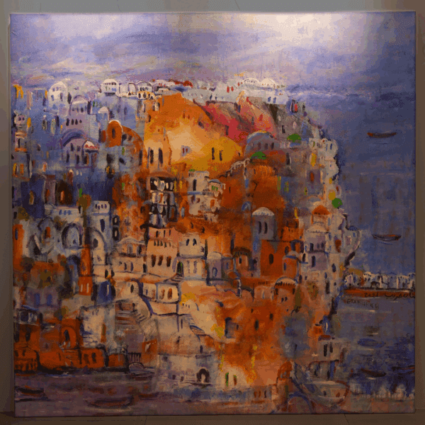 “Back Home” by Etab Hreib is an acrylic on canvas steeped in emotion and light. A city rises from the water in tones of amber and blue half remembered, half reborn. The houses seem to merge with the sky, their outlines fading like memories that never quite leave. It is a return not to a place, but to a feeling the warmth of belonging, the ache of distance, the quiet beauty of recognition. Hreib paints home as something both lost and eternal, where every color carries a trace of love and departure.