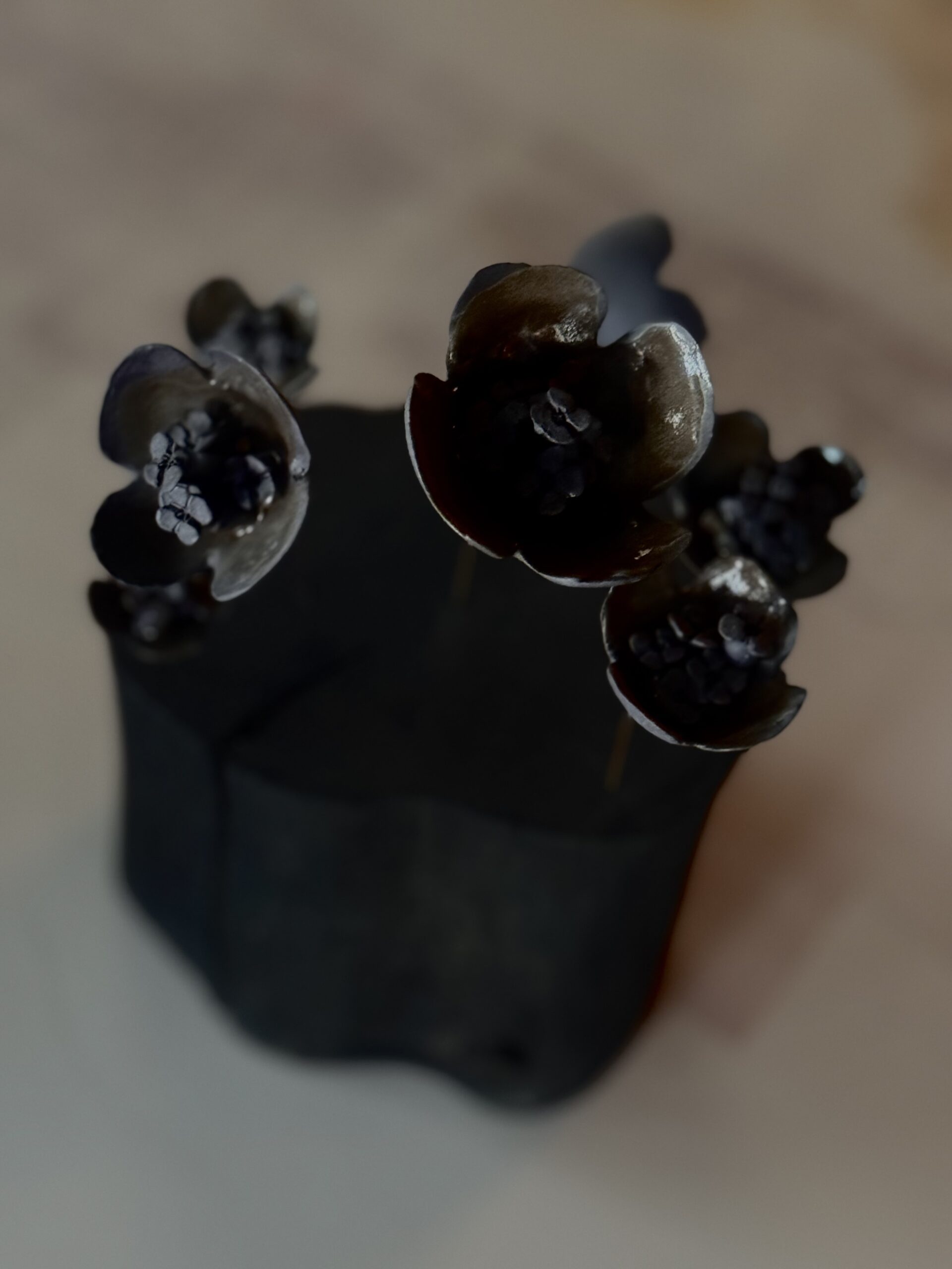Petals unfold mid-air, suspended as if caught between earth and sky. Each shell-like form reveals hidden clusters, a quiet miracle of life rising from charred roots. Bloom is a moment of awakening, fragile yet eternal.