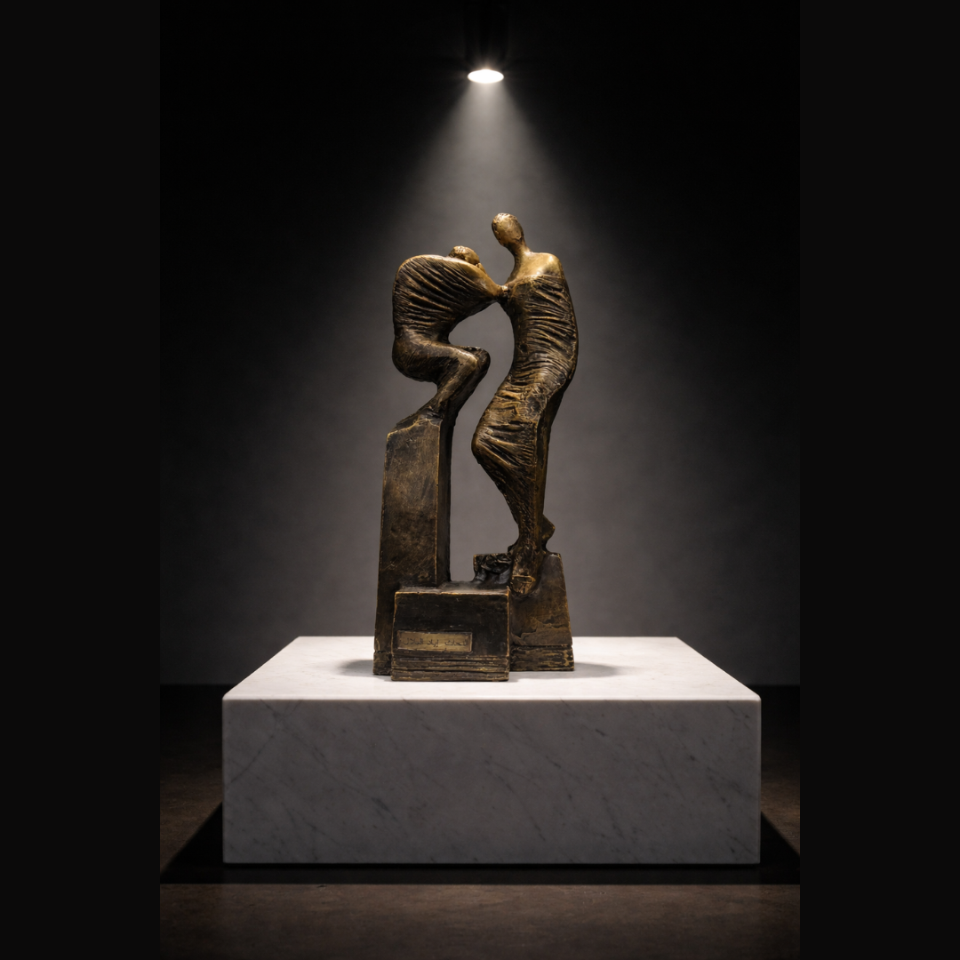 Eyad Albelal, a sculptor educated at the Faculty of Fine Arts in Damascus, approaches the human figure through material. In this exhibition, his works are primarily realized in polyester, shaped through a process of reduction that strips form to its essence. His figures exist between stillness and movement, carrying both weight and fragility, where form becomes a state of being rather than a fixed structure.
