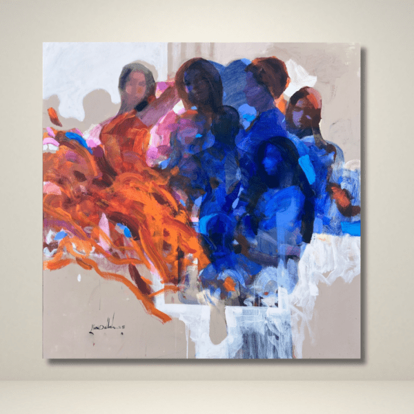 A vivid collision of blues and burning orange, where figures emerge and dissolve between emotion and gesture.