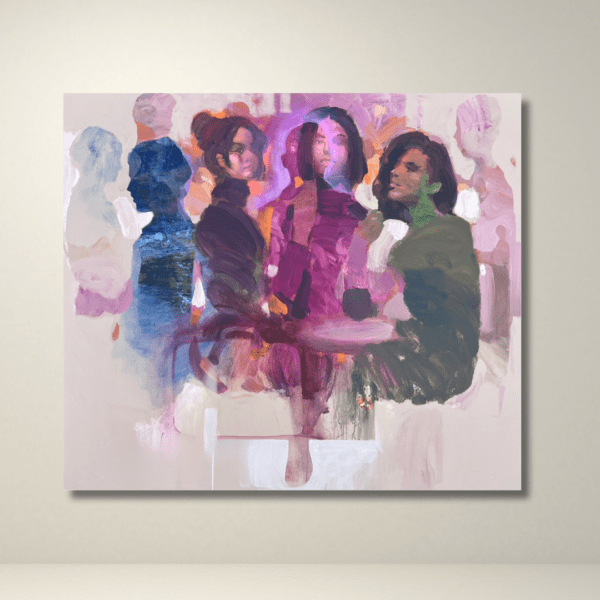 Three figures rise from strokes of violet, rose, and deep green — a quiet moment suspended between intimacy and distance.