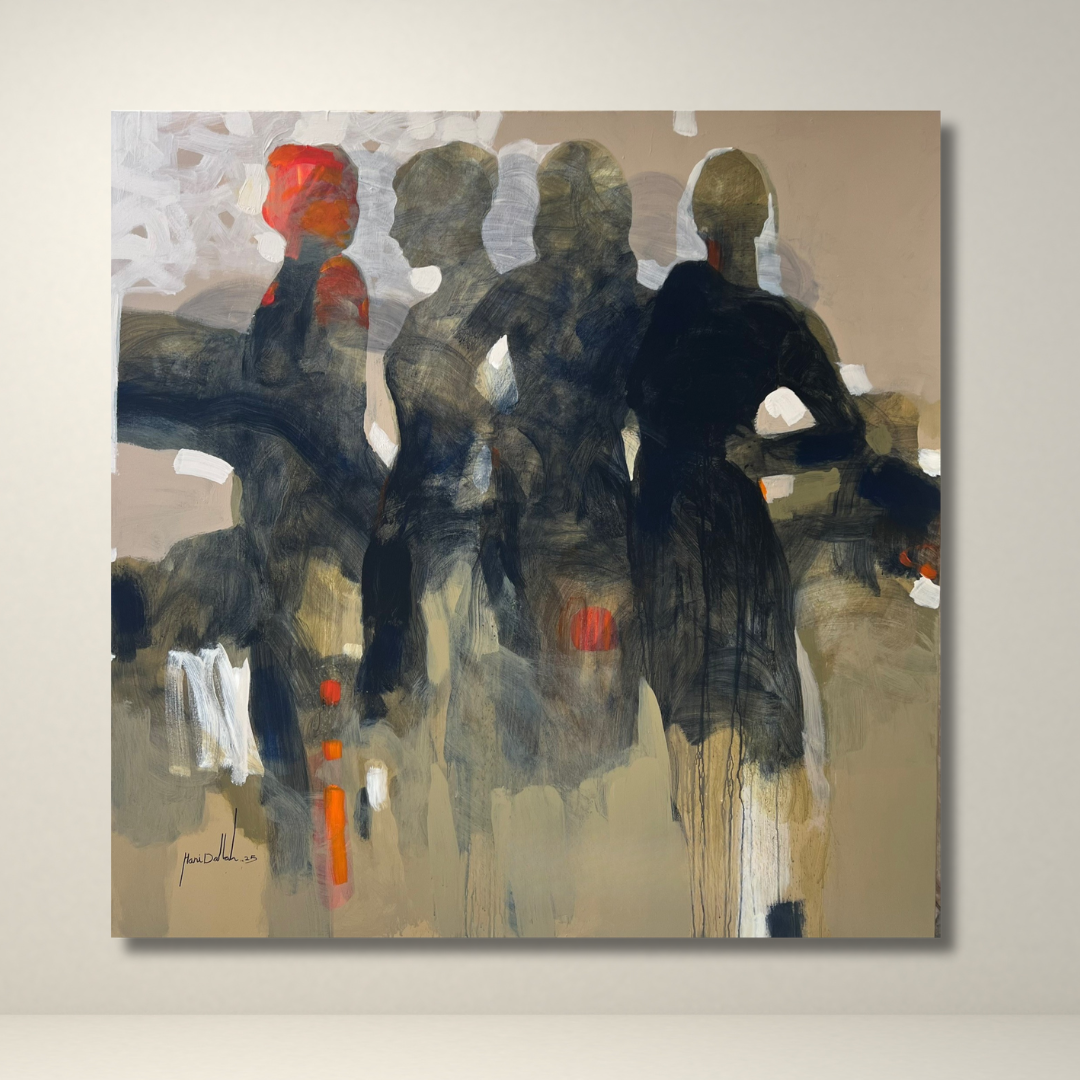 Hani’s abstract-figurative expression blends mystery, movement, and subtle emotional dialogue within softened silhouettes.