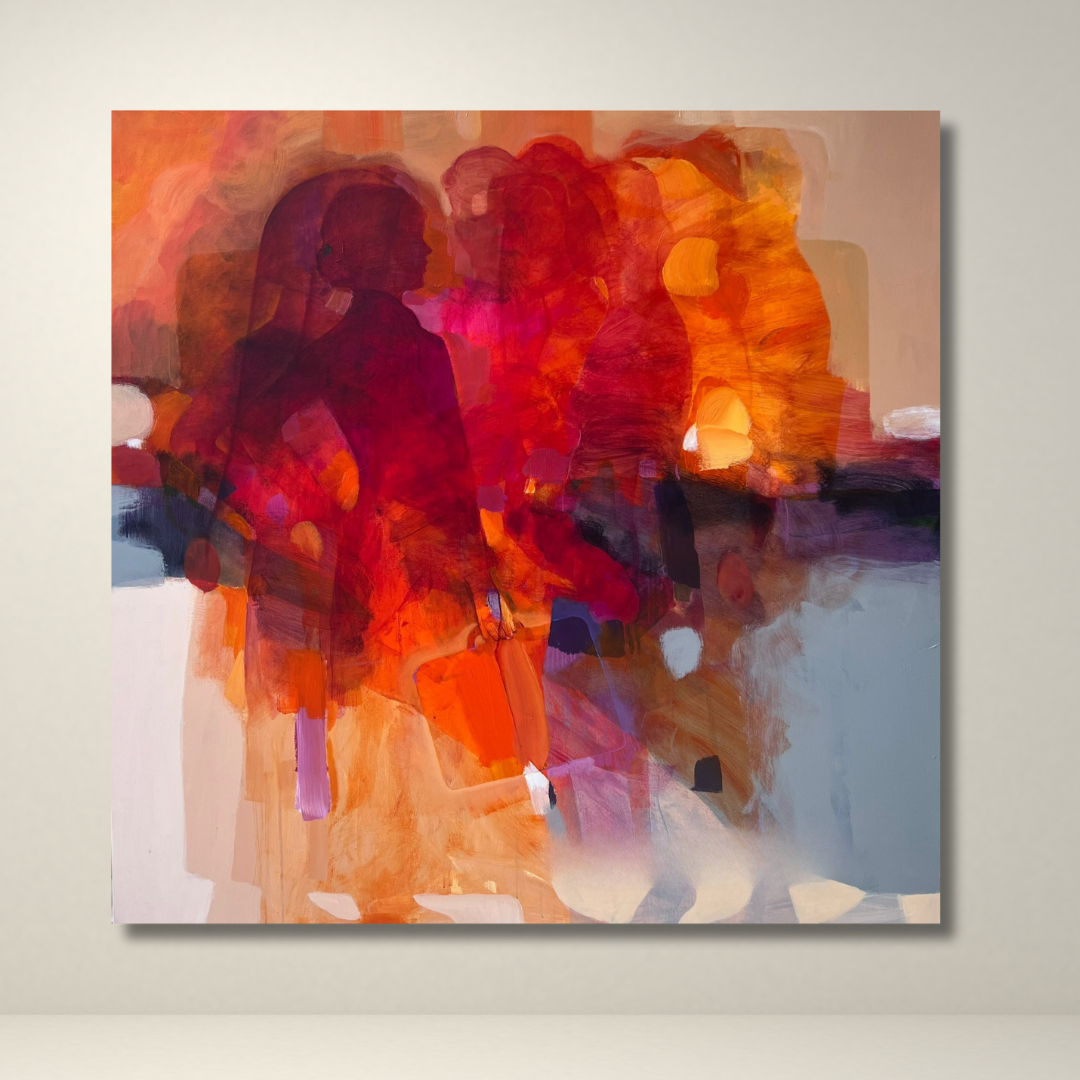Figures shimmer in layers of crimson, orange, and rose, a scene glowing like embers caught between movement and memory.