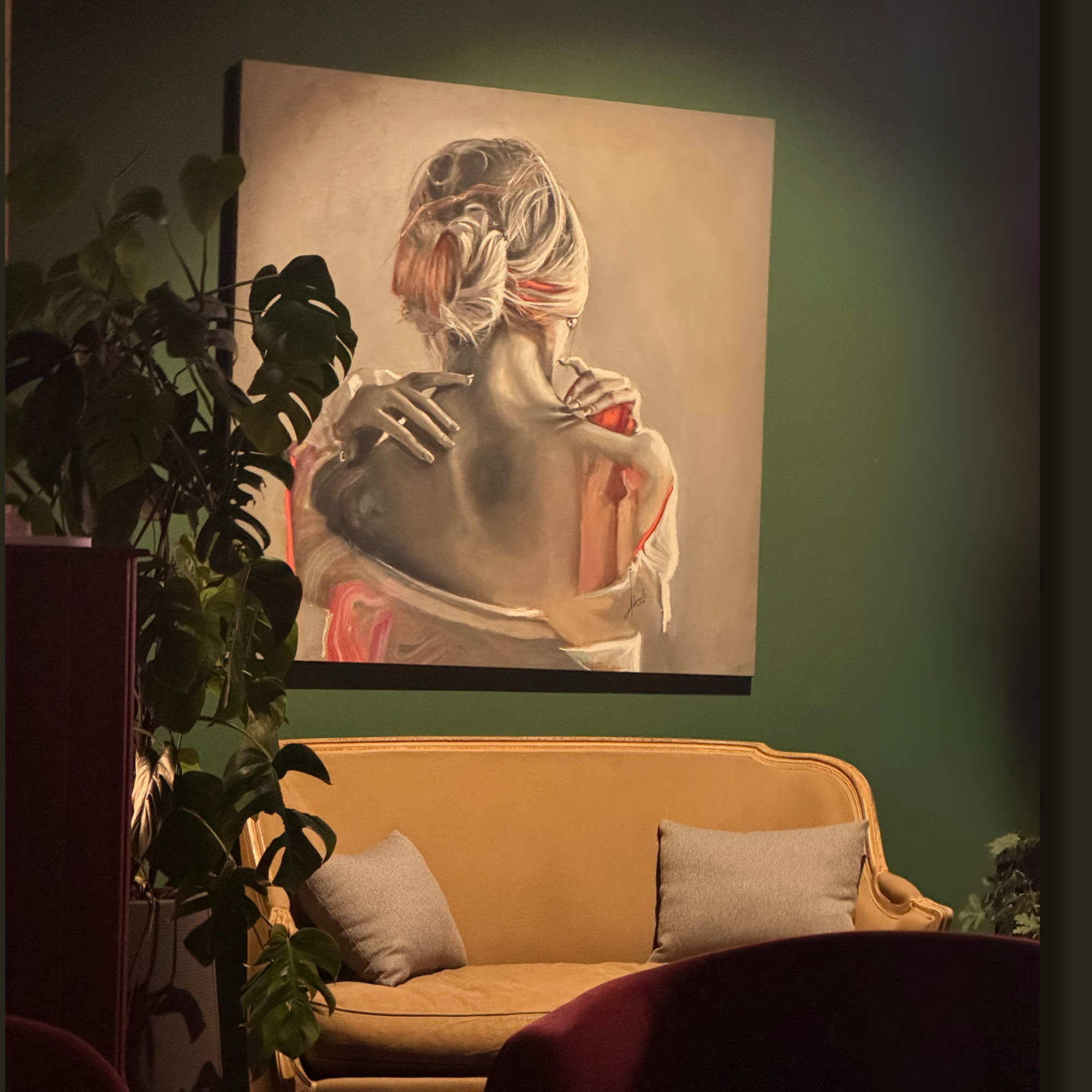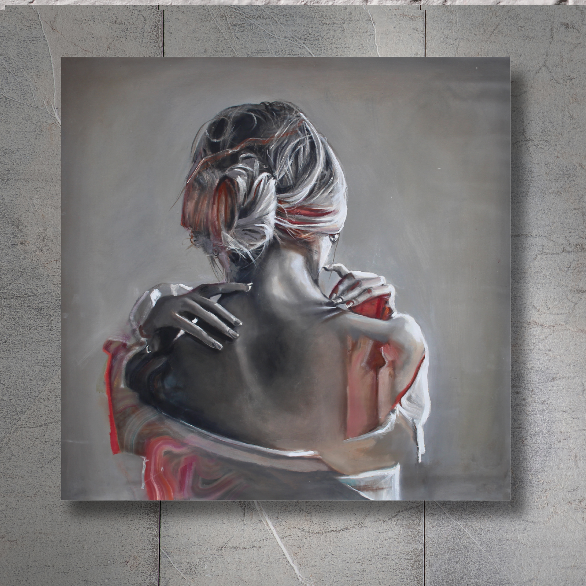 In Confrontation, a woman turns her back to us, her form framed in muted tones and soft light. Yet her posture, tense and protective, speaks louder than her hidden face. The figure holds herself, arms crossing as if shielding against both external judgment and internal turmoil. This confrontation is not with another, but with the self, between fragility and strength, retreat and resistance.