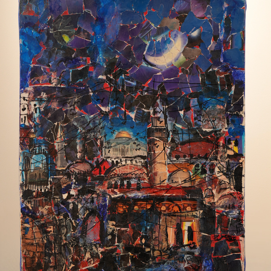“Crescent Moon” by Etab Hreib unfolds like a nocturne of remembrance. Under a sky split by light and shadow, a city rises layered, wounded, yet luminous. The crescent above is not only celestial; it is a symbol of endurance, a silent witness to cycles of loss and renewal. Hreib’s fragmented textures mirror the way memory survives never whole, but always alive. Through torn paper, deep blues, and glimmers of gold, she turns brokenness into rhythm, darkness into grace. The moon, tender and eternal, becomes the pulse of a city that still dares to dream.