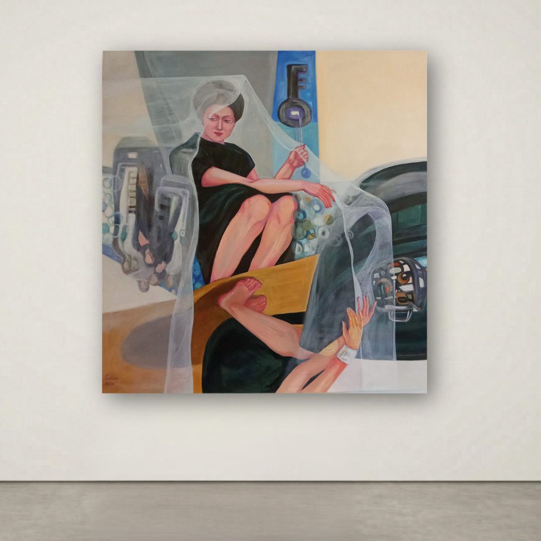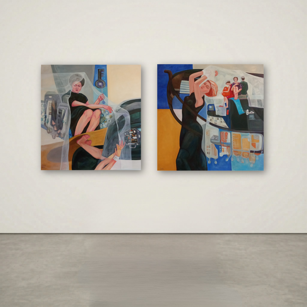 Salam Ahmad, trained in Fine Arts in Syria, works through painting as an intimate, emotional language. Her compositions emerge from quiet inner spaces, where feelings take form before they are spoken. The body dissolves into sensation, and color, especially grey, becomes a field of reflection, suspended between presence and absence, fullness and emptiness.