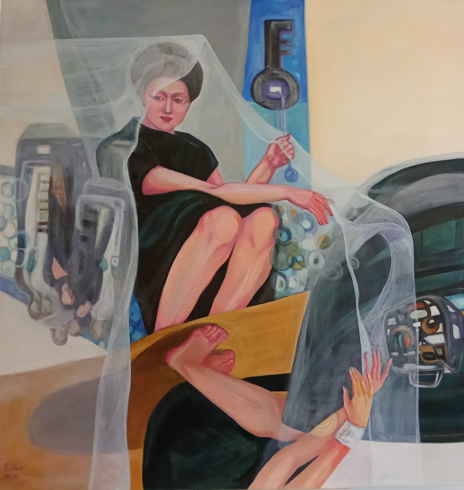 The palette balances soft neutrals with sharper blues and ochres, while the presence of the key introduces a symbolic axis—hinting at access, passage, or the possibility of release.