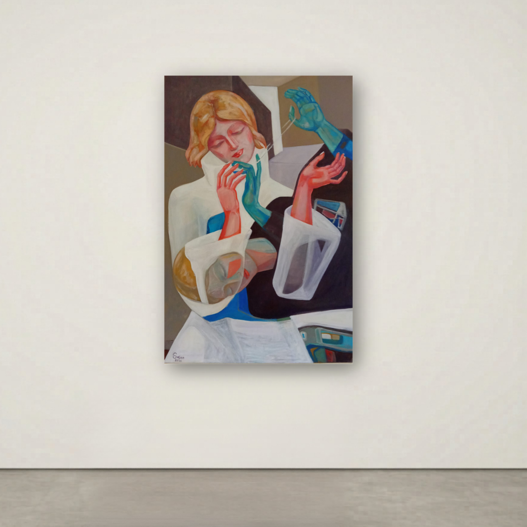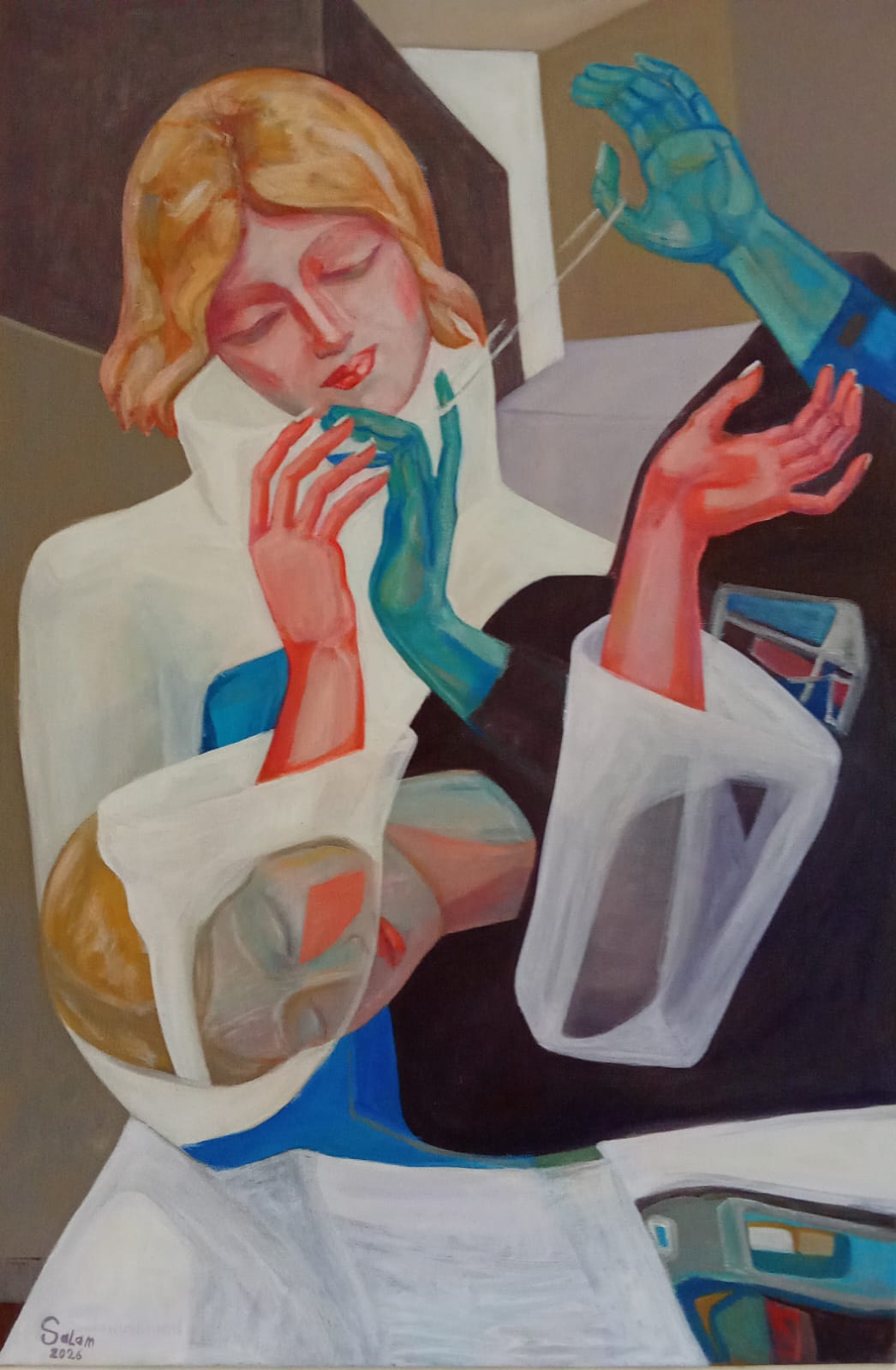 Salam Ahmad, trained in Fine Arts in Syria, works through painting as an intimate, emotional language. Her compositions emerge from quiet inner spaces, where feelings take form before they are spoken. The body dissolves into sensation, and color, especially grey, becomes a field of reflection, suspended between presence and absence, fullness and emptiness.