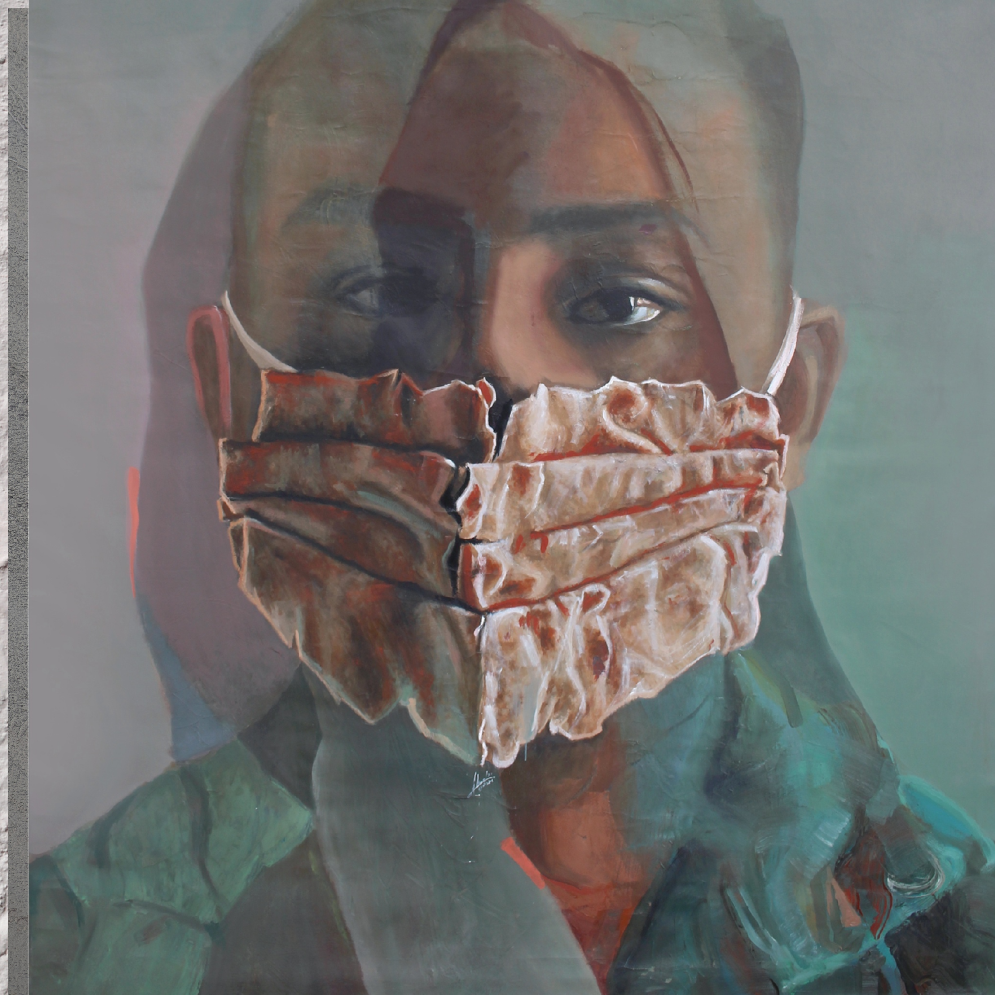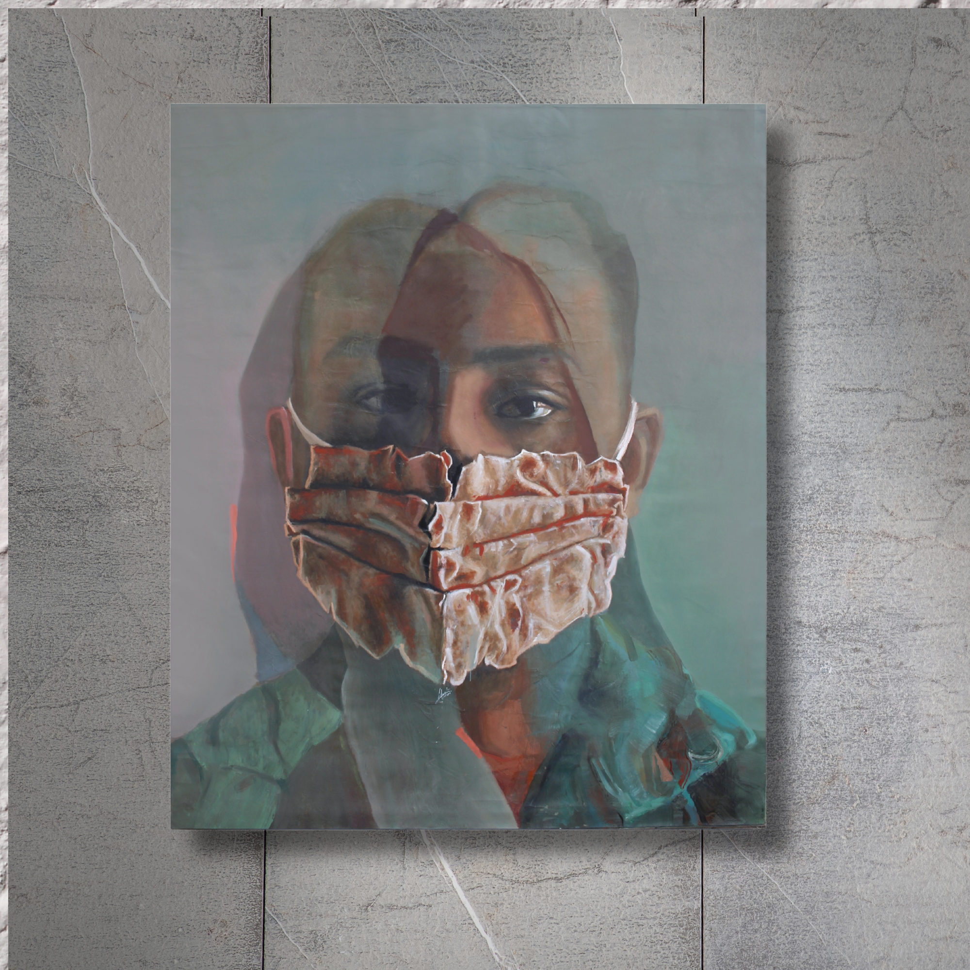 In Daily Task, the face emerges behind a mask sculpted not from cloth, but from bread. At once fragile and essential, the bread-mask transforms into a haunting metaphor: survival stitched across the mouth, nourishment pressed into silence. The dual portrait layering suggests blurred identities, individual and collective, bearing the weight of routine in uncertain times.