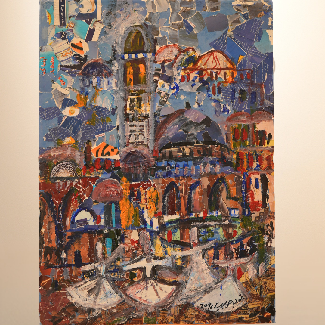 “Darawiches” by Etab Hreib captures the sacred rhythm of movement a visual dance between devotion and transcendence. Torn fragments of paper, painted textures, and glimmers of color converge into a city alive with whirling forms the dervishes in mid-turn, their white robes spiraling like prayers released into air. At the heart of the composition, architecture and spirit merge. Minarets rise above swirling bodies, domes shimmer beneath a fractured sky, and the entire scene vibrates with the pulse of divine repetition motion as meditation, chaos as grace.