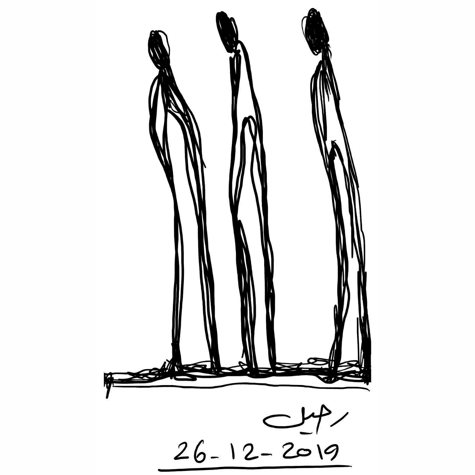 Eyad Jouda reflects on displacement and resilience. The figures are stripped of detail yet heavy with presence, embodying the universal human journey of migration, struggle, and survival. Their forward-leaning postures suggest both fatigue and determination, a testimony of endurance.