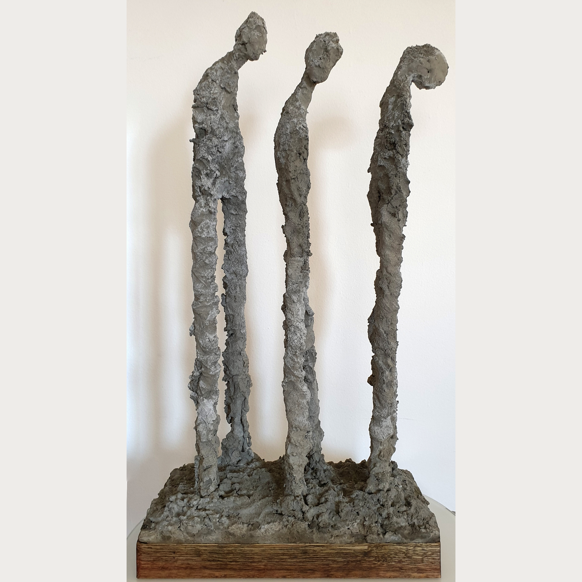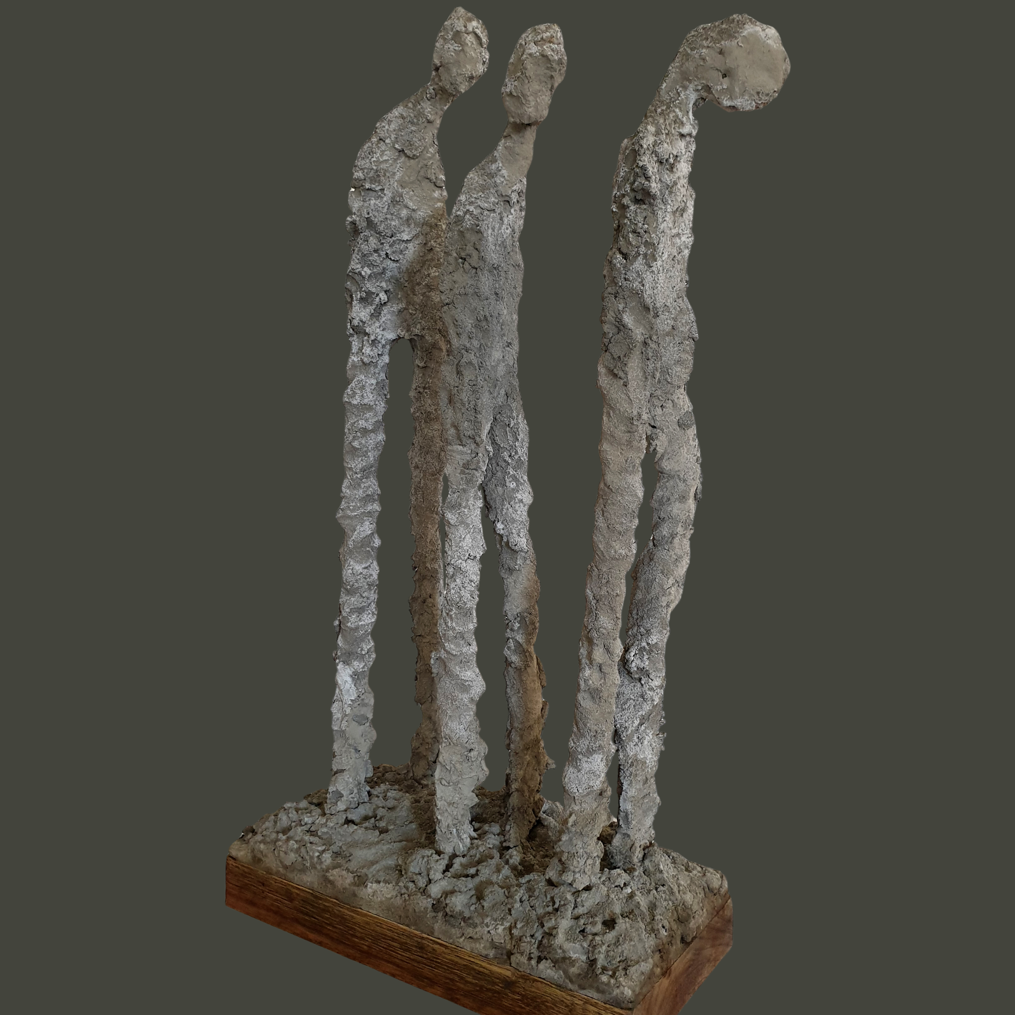 Three elongated figures lean forward, their bodies rough with texture, their heads bowed in silence. Exodus captures the weight of departure, a timeless story of leaving behind, moving forward, and carrying memory in every step.