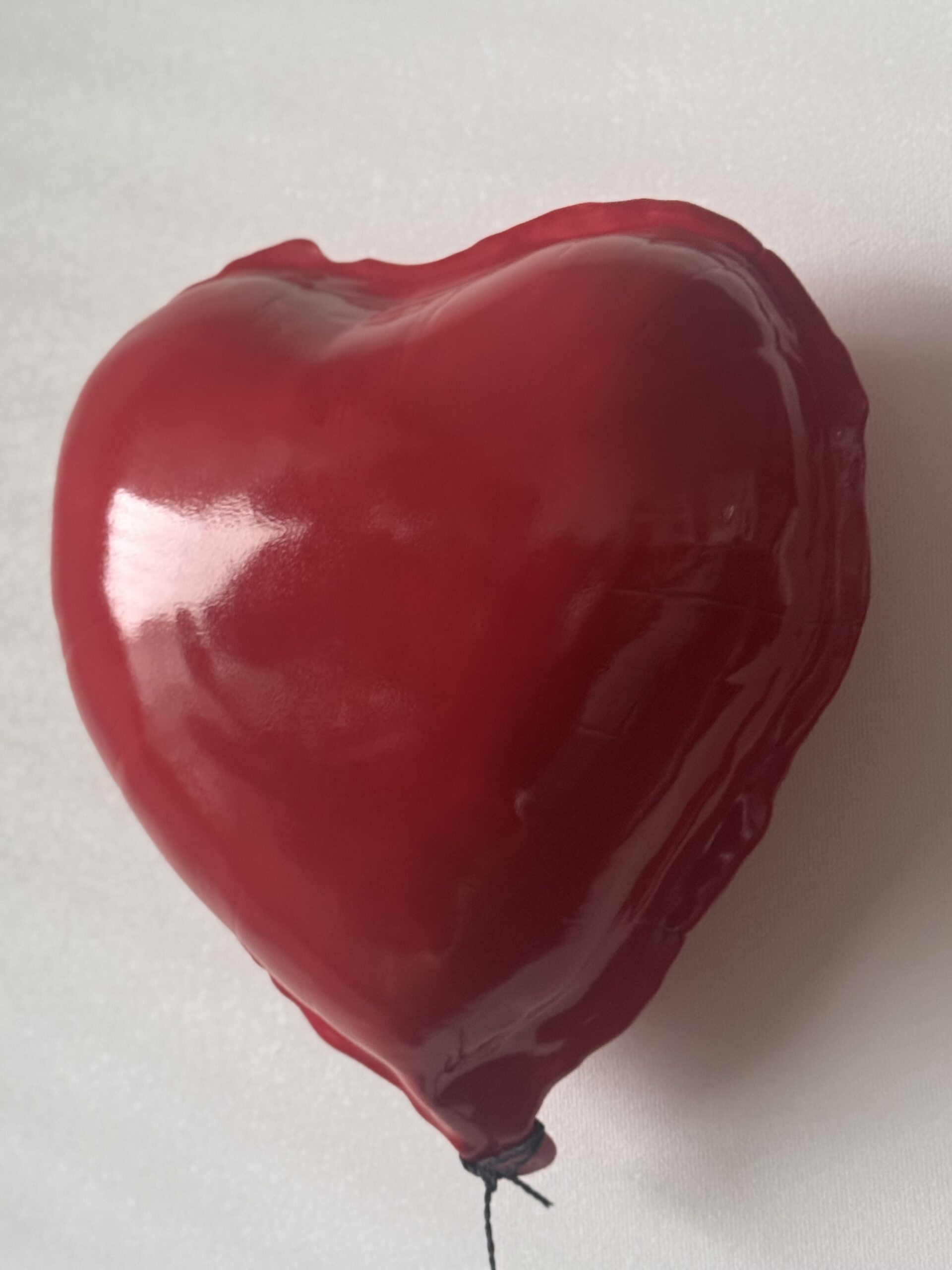 A glossy red heart, full and bright, hovers like a balloon of love. What is usually fleeting, a balloon that fades becomes here eternal, sculpted to keep affection alive.