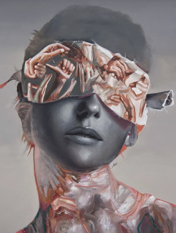 Ahmad Alwaari, a self-taught Syrian artist, blends realism with abstraction to bridge tradition and modernity. His iconic “Syrian chair” symbolizes resilience and power. In The Modern World, he explores the impact of digital transformation on human connection, reflecting on societal shifts with a signature coral and silver palette.