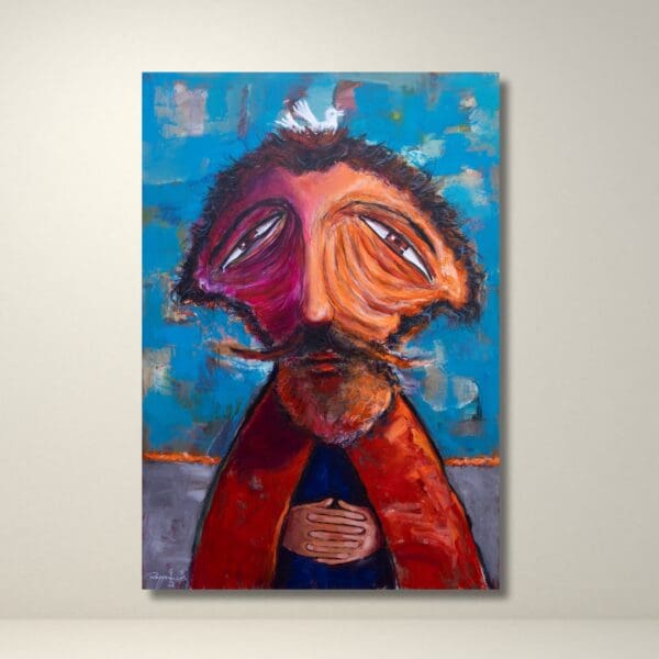 A fragile symbol of peace rests upon Mr. Y’s head, present yet distant. He remains still beneath its weight, suggesting that peace is not possessed, but carried as a quiet and uncertain hope.