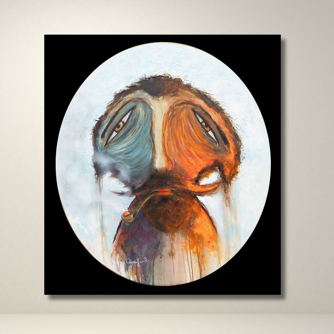 Each portrait is contained within a circular frame, emphasizing the figure as a self-contained presence. Shifts in color, density, and surface texture create distinct visual states, while drips, smoke, and softened edges suggest gradual alteration of form. The repetition of the figure across the series highlights variation within continuity, allowing each work to exist as both an individual image and part of a larger whole.