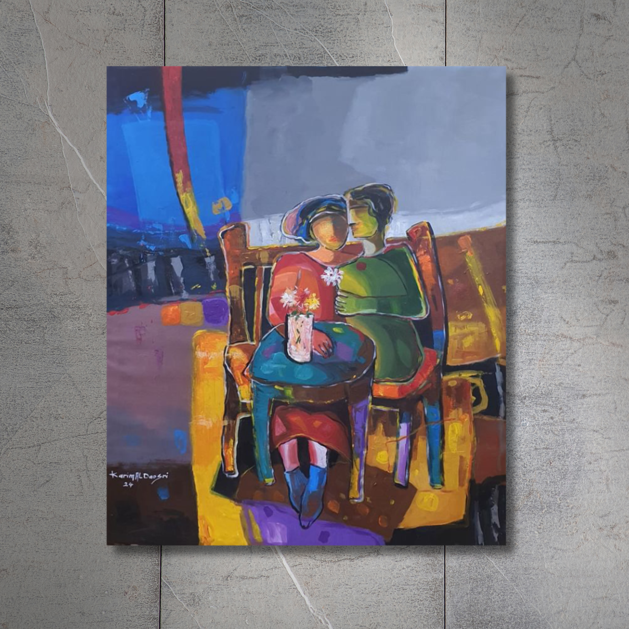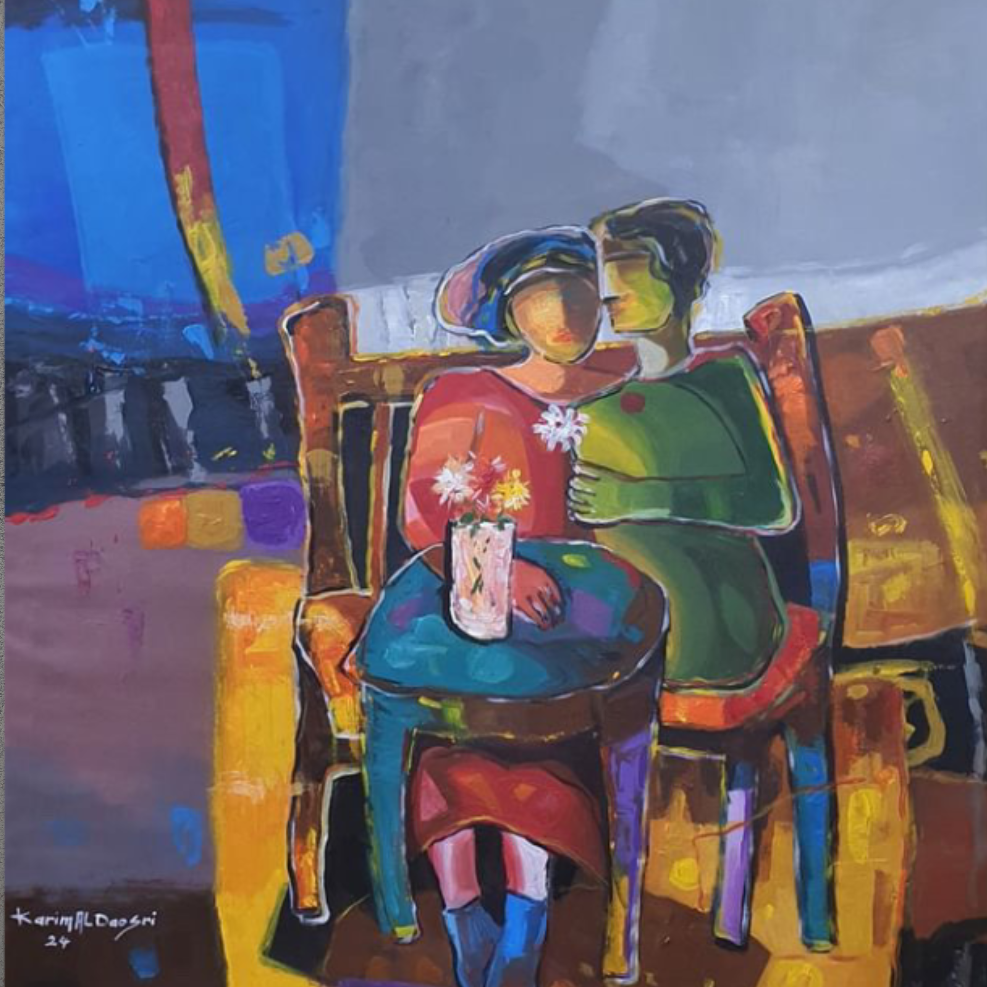 With Jasmin, Karim AlDosari distills intimacy into pure chromatic language. The figures are less about likeness and more about essence, the closeness of companionship glowing brighter than the outlines that define them.
