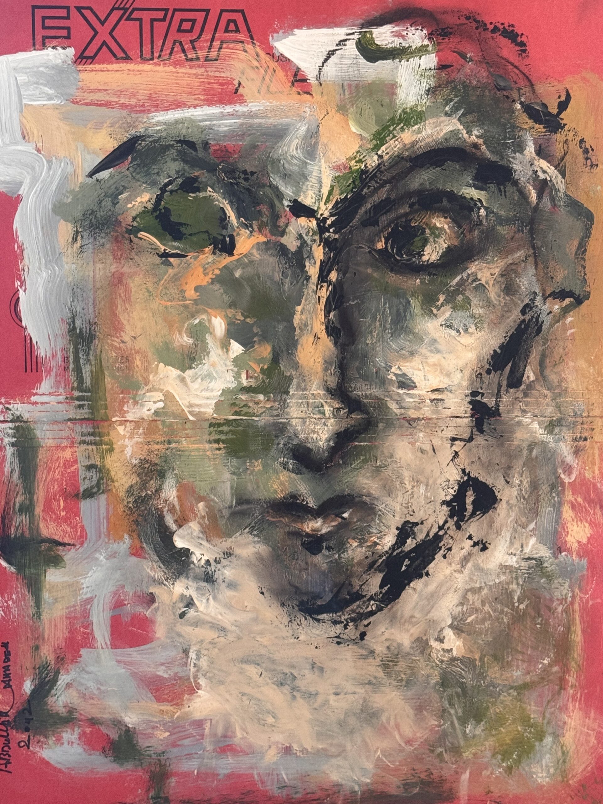 Swirls of color and chaos collide, forming a fractured face that is both haunting and vulnerable. The greens, blues, and reds bleed into one another, echoing scars of memory and the rawness of survival. The portrait feels less like a likeness and more like an x-ray of the soul, where anguish, resilience, and humanity coexist.