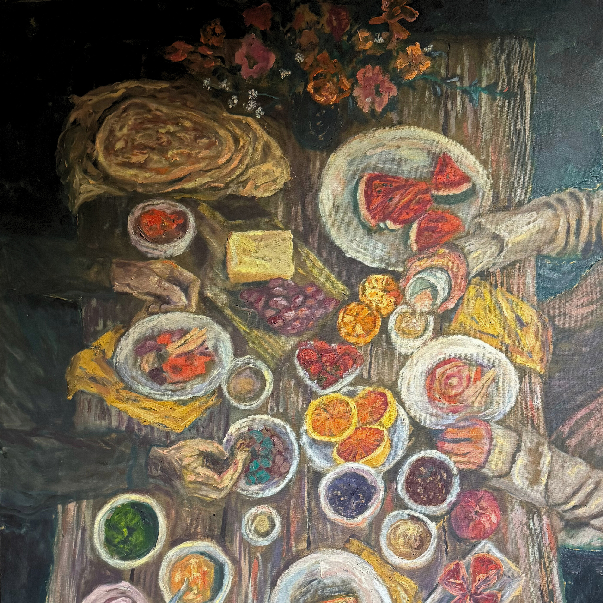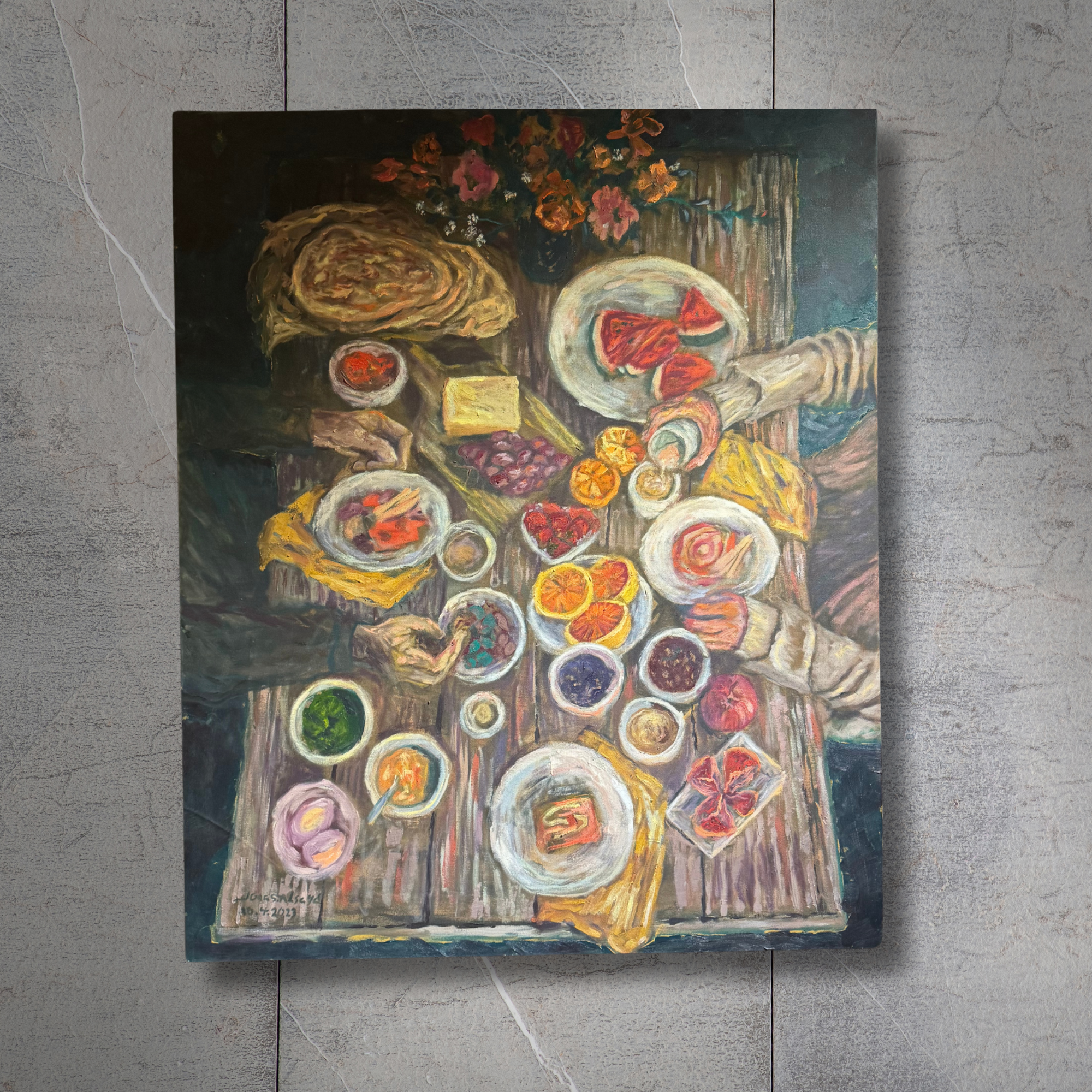In Love in Damascus, the table stretches beyond food, it becomes a canvas of memory and affection. Citrus, bread, and vibrant dishes evoke the warmth of Syrian hospitality, while tender gestures between figures anchor the scene in intimacy. It is a portrait of a city’s soul, where love is served as generously as the meal.