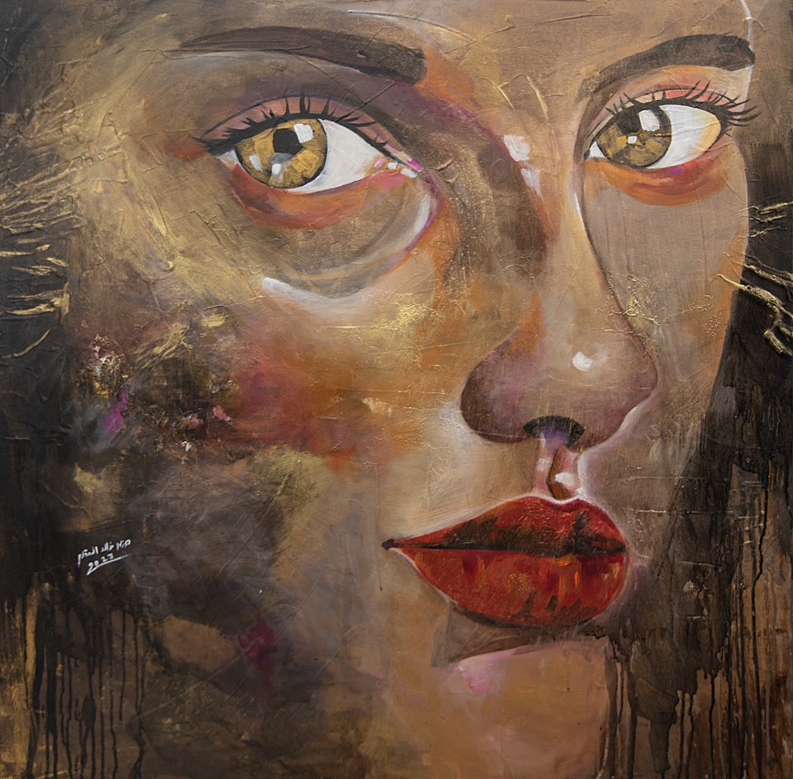 Golden hues wash across a face that holds both silence and fire. The eyes, sharp with memory, gleam like mirrors of untold stories, while the lips, painted in vivid crimson, seem poised to break their silence. Memoires is not just a portrait, but an imprint of all that lingers grief, resilience, and fragments of lived truth.