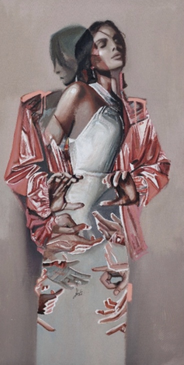 Ahmad Alwaari, a self-taught Syrian artist, blends realism with abstraction to bridge tradition and modernity. His iconic “Syrian chair” symbolizes resilience and power. In The Modern World, he explores the impact of digital transformation on human connection, reflecting on societal shifts with a signature coral and silver palette.