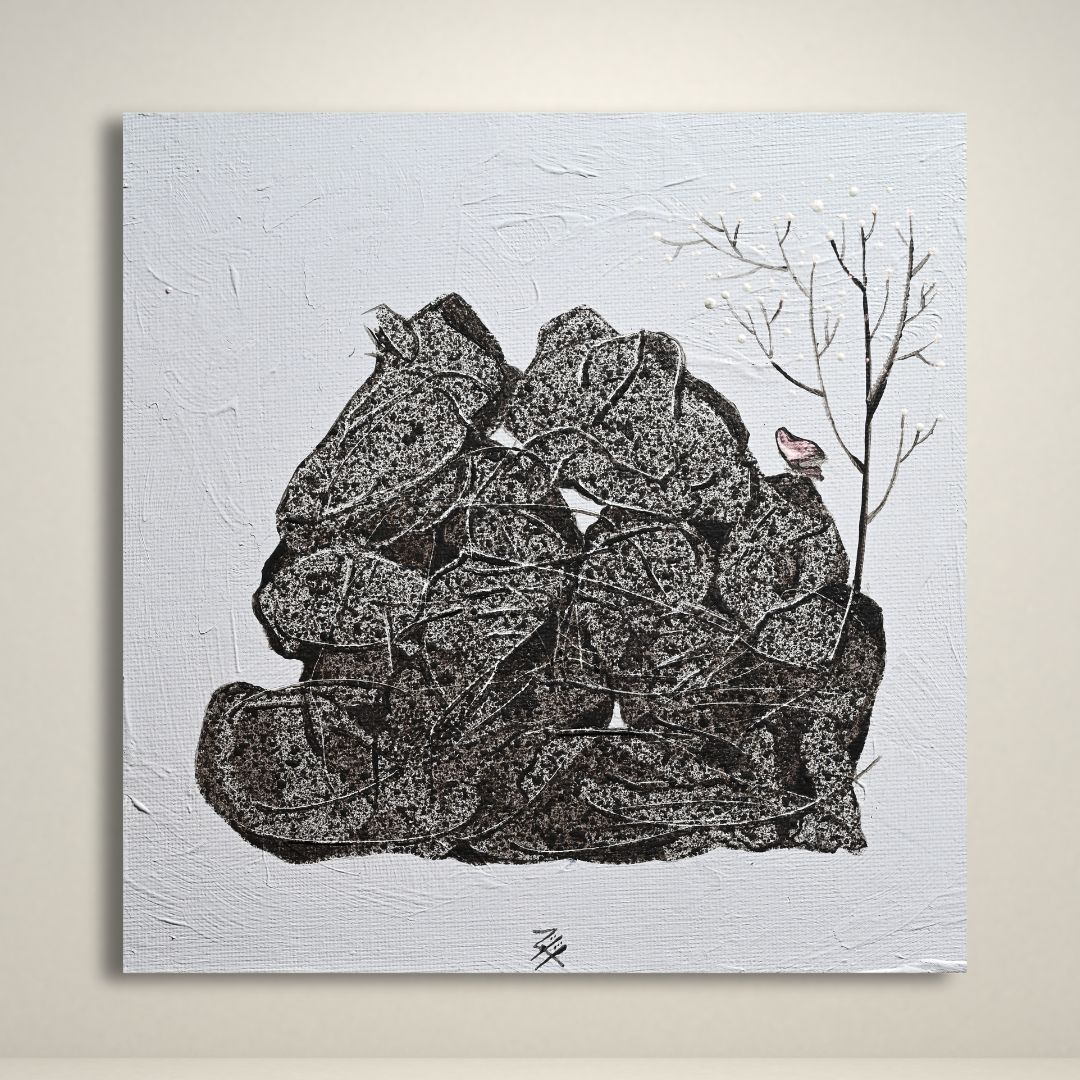 Within these evolving shades, Nawar places his figures — tender, sculptural silhouettes carrying delicate rose-pink jasmine. The blossoms shimmer softly against the monochrome fields, appearing almost illuminated, as if the flowers themselves are the keepers of warmth, hope, or a story not yet spoken aloud.