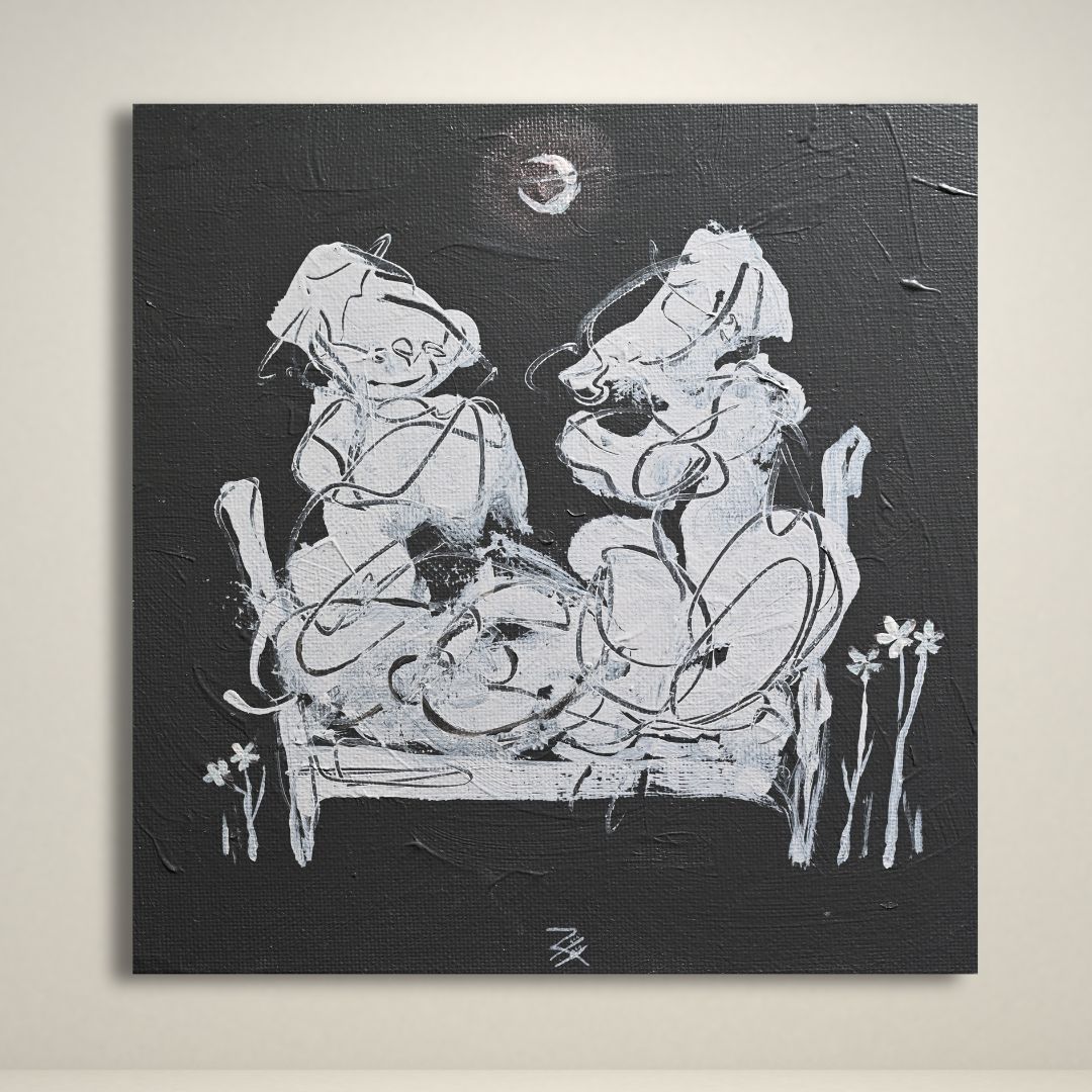 Through expressive abstraction and finely-etched line work, Shartouh captures moments of companionship, tenderness, and simple human rituals. The figures emerge softly from textured backgrounds, forming a series that feels intimate, poetic, and deeply interconnected._