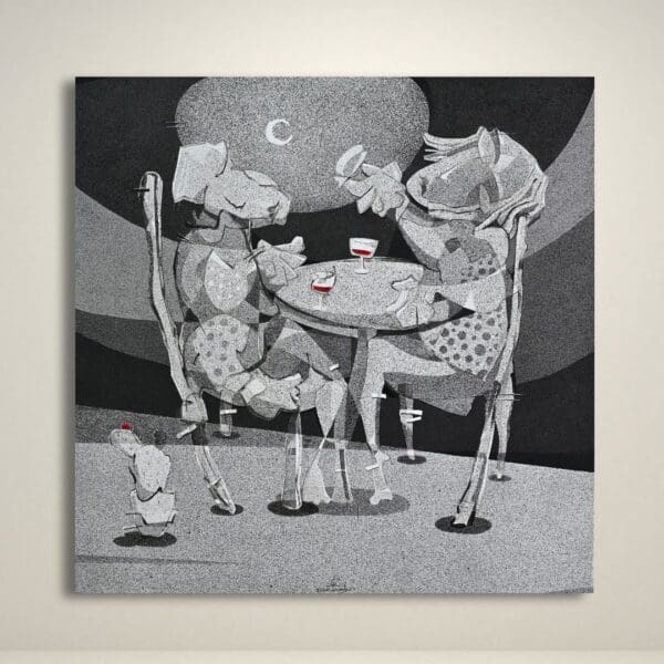 In “Patience in the Cure,” Shartouh transforms an ordinary moment into a quiet ritual of healing. Two figures sit beneath a pale crescent moon, sharing small cups that feel both celebratory and medicinal, as if recovery is found not in solitude but in companionship. The layered forms, soft greys, and playful patterns create a scene that is light-hearted yet deeply human.