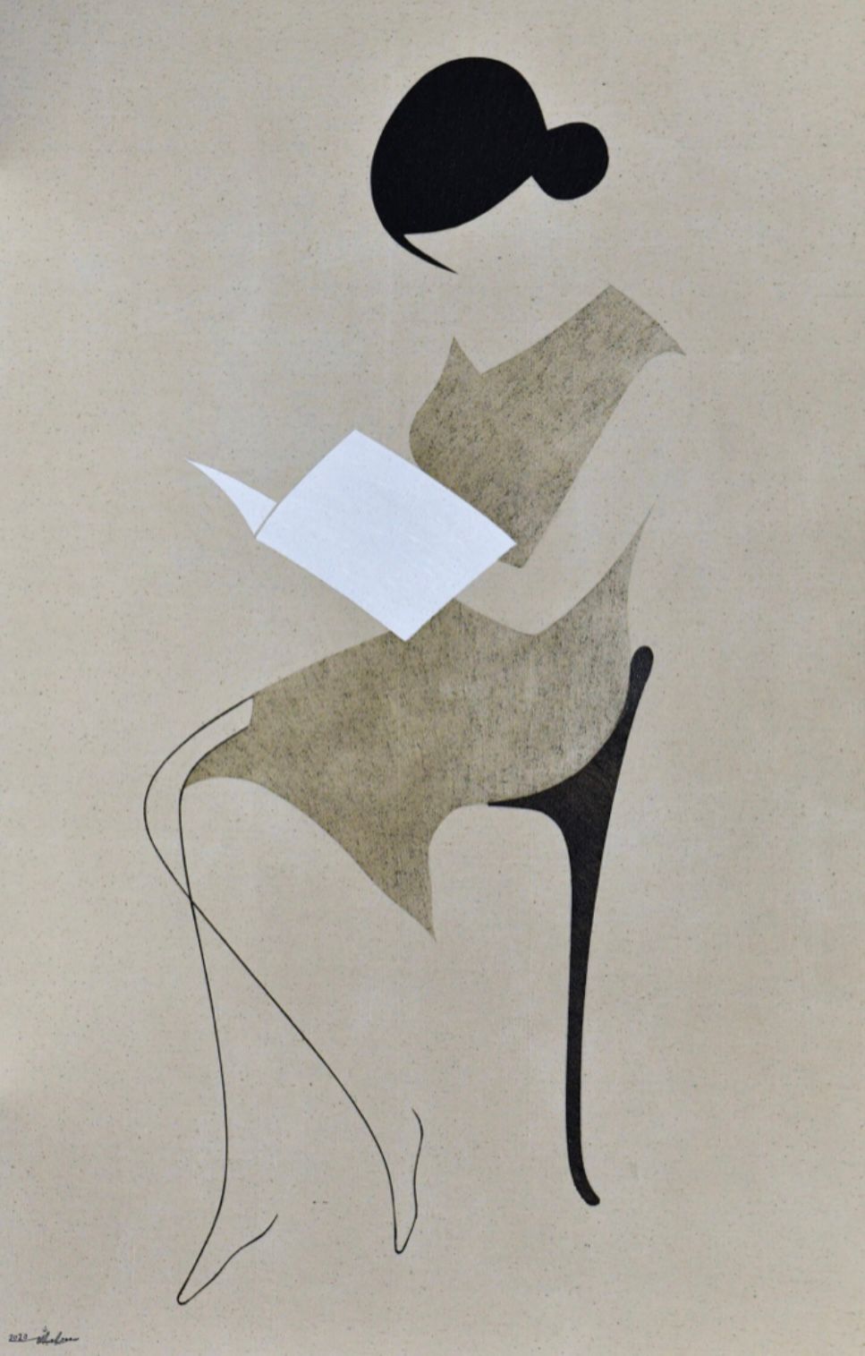 Minimal strokes sketch out a woman and her cat, moments of quiet companionship distilled into pure form. Reading, sitting, playing, each gesture is intimate yet universal: the poetry of daily life made timeless.