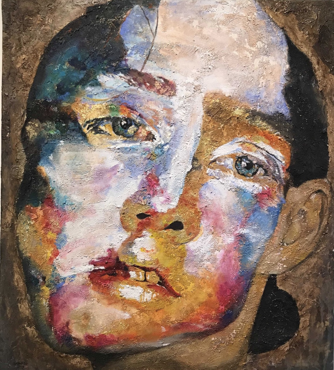 A face emerges fractured by streams of color and light, yet beneath the masculine presence, a quieter feminine visage presses through. The two overlap like memory and shadow, revealing the duality of self. Blues, reds, and golds ripple across the canvas, as if emotion itself had left its trace upon the skin.