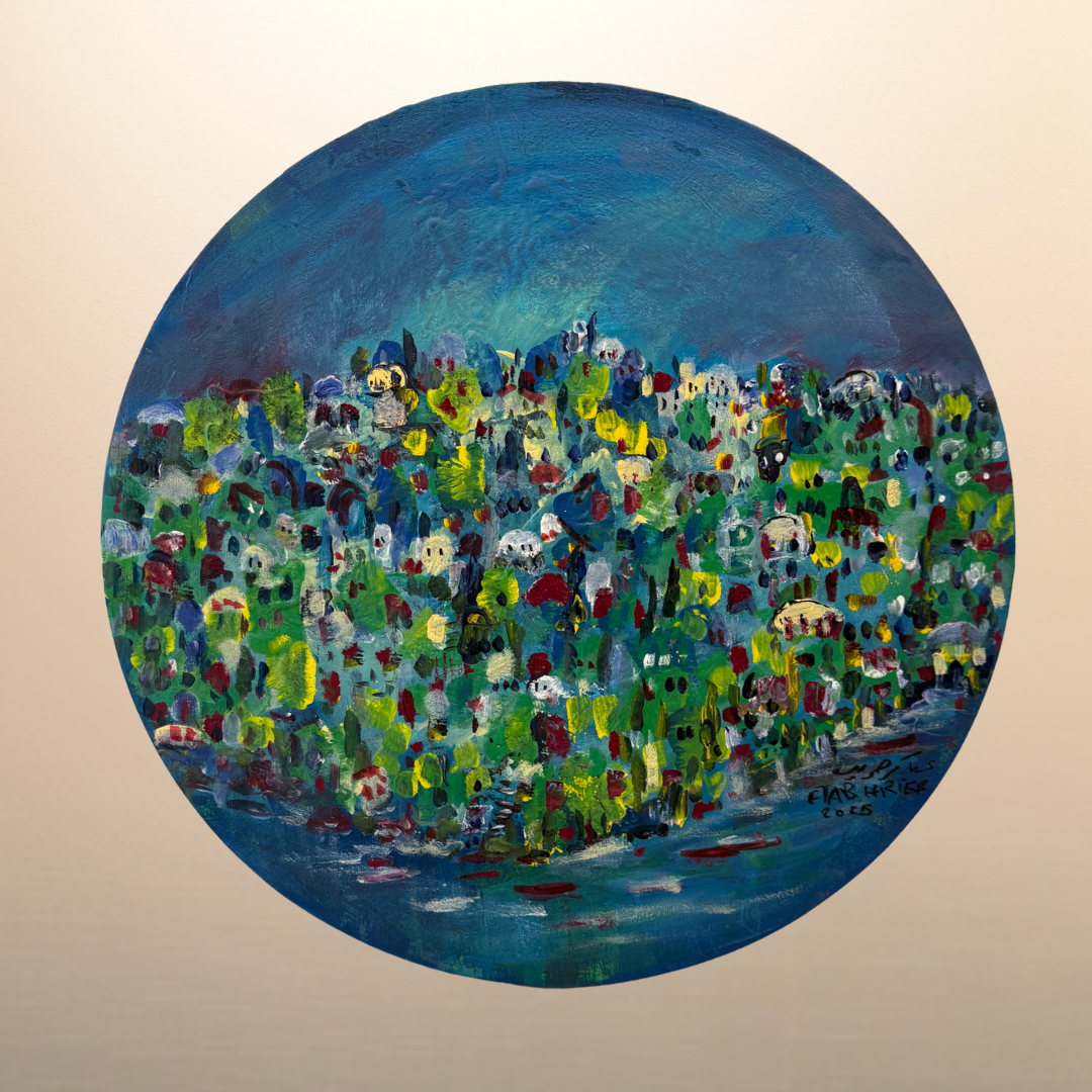Alive with rhythm and renewal, Spring blossoms in green and gold — a city breathing after rain. Through bold strokes and vibrant hues, Hreib captures a quiet rebirth, where nature and memory intertwine.
