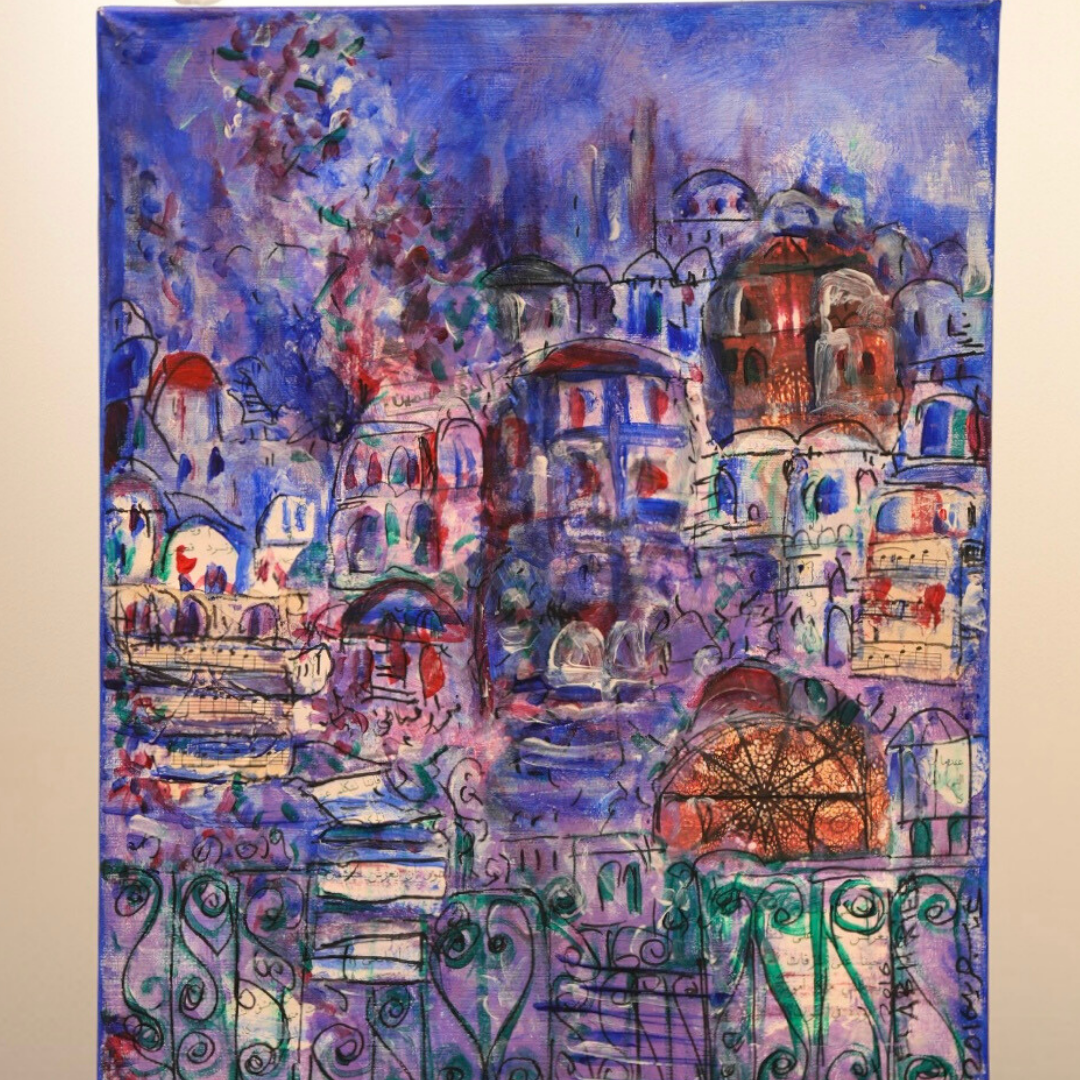 “Stories and Walls” by Etab Hreib feels like opening a book written in color and silence. The painting hums with life domes, windows, and balconies overlap like pages from different times, each holding a whisper of what once was. Hreib does not paint a city as much as she resurrects one built from longing, layered in memory, alive with absence. The violet tones breathe dusk, that fragile hour when the day dissolves into reflection. Rusts and reds pulse beneath, as if the walls themselves remember of laughter, of departure, of quiet endurance. The balcony in the foreground becomes a threshold between observer and remembered life, between what we see and what still speaks beneath the surface.