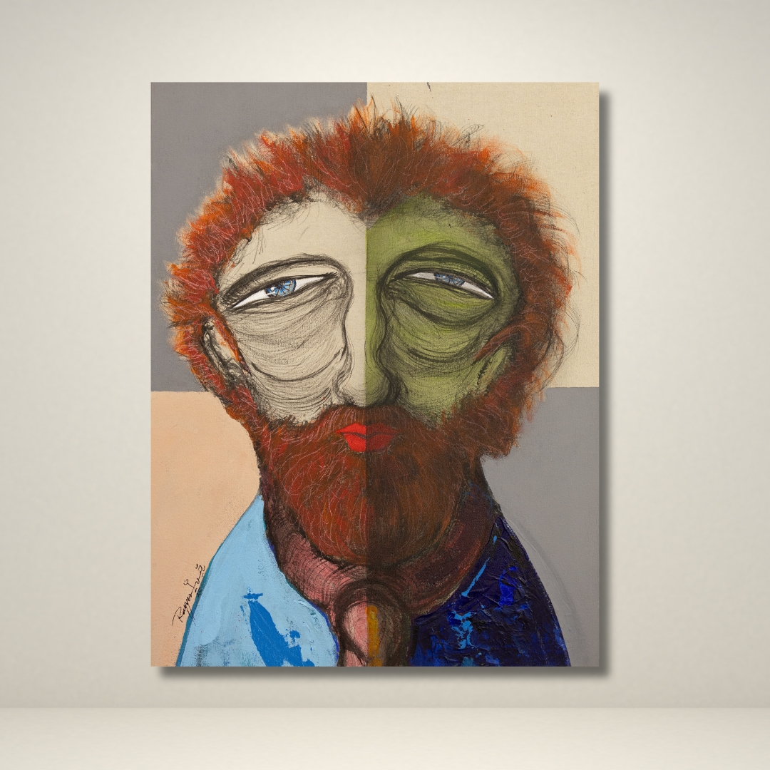 The figure is divided into contrasting halves, distinguished through shifts in tone, texture, and mark-making. One side appears rendered through linear detail, while the other is built through heavier color and layered paint. The surface reveals traces of both careful drawing and spontaneous gesture. The composition holds these differences in balance, allowing the image to exist as a convergence of multiple visual languages within a single form.
