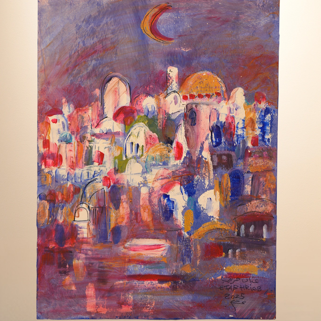 Beneath a violet sky, domes and arches shimmer in shades of rose, gold, and blue a city bathed in tenderness. Above it all, a crescent moon glows quietly, as if watching over what the world has forgotten. Hreib paints light as emotion, fragile yet enduring. The scene is not just nightfall; it is a moment of stillness between what was lost and what continues to shine. In her hands, the moon becomes a keeper of stories, and the city below a heartbeat that refuses to fade.