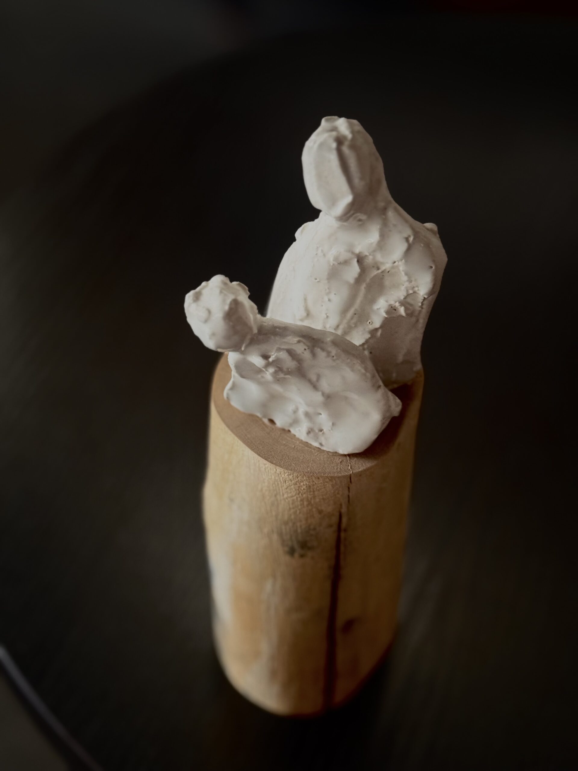 Two figures emerge from a single wooden base, one upright, one leaning. Their faceless forms suggest not individuals but guardians, still, silent, and attentive. The Watchers hold space, embodying the comfort and mystery of being seen.