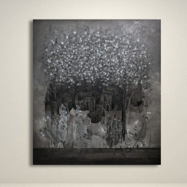 ” Truth Surfaced” stands as one of Shartouh’s most intricate and emotionally charged works — a monumental composition where light, memory, and hidden narratives rise through layers of shadow. Beneath the blooming crown of delicate jasmine, faint silhouettes, fragmented architecture, and quiet figures emerge as if revealed over time, echoing truths that refuse to remain buried.