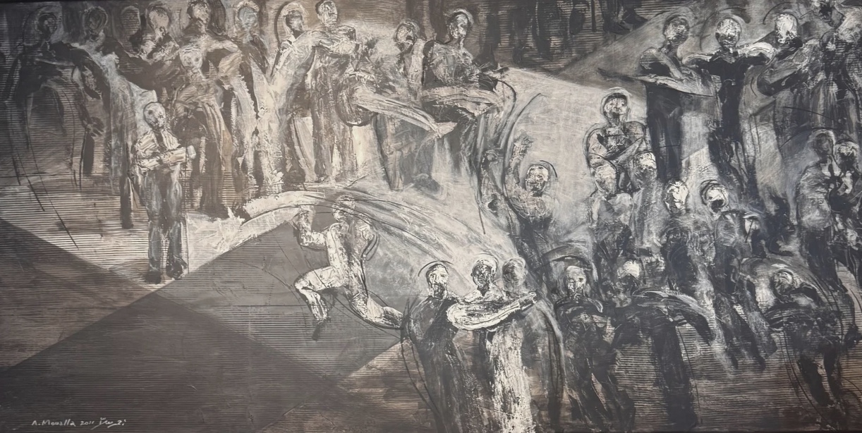 Moualla composes human movement as symphony and struggle. In this piece, his figures transcend individuality, merging into a continuum of memory, ritual, and revolt. The layering of gestures reveals his fascination with how crowds both preserve and erase identity within their tide.