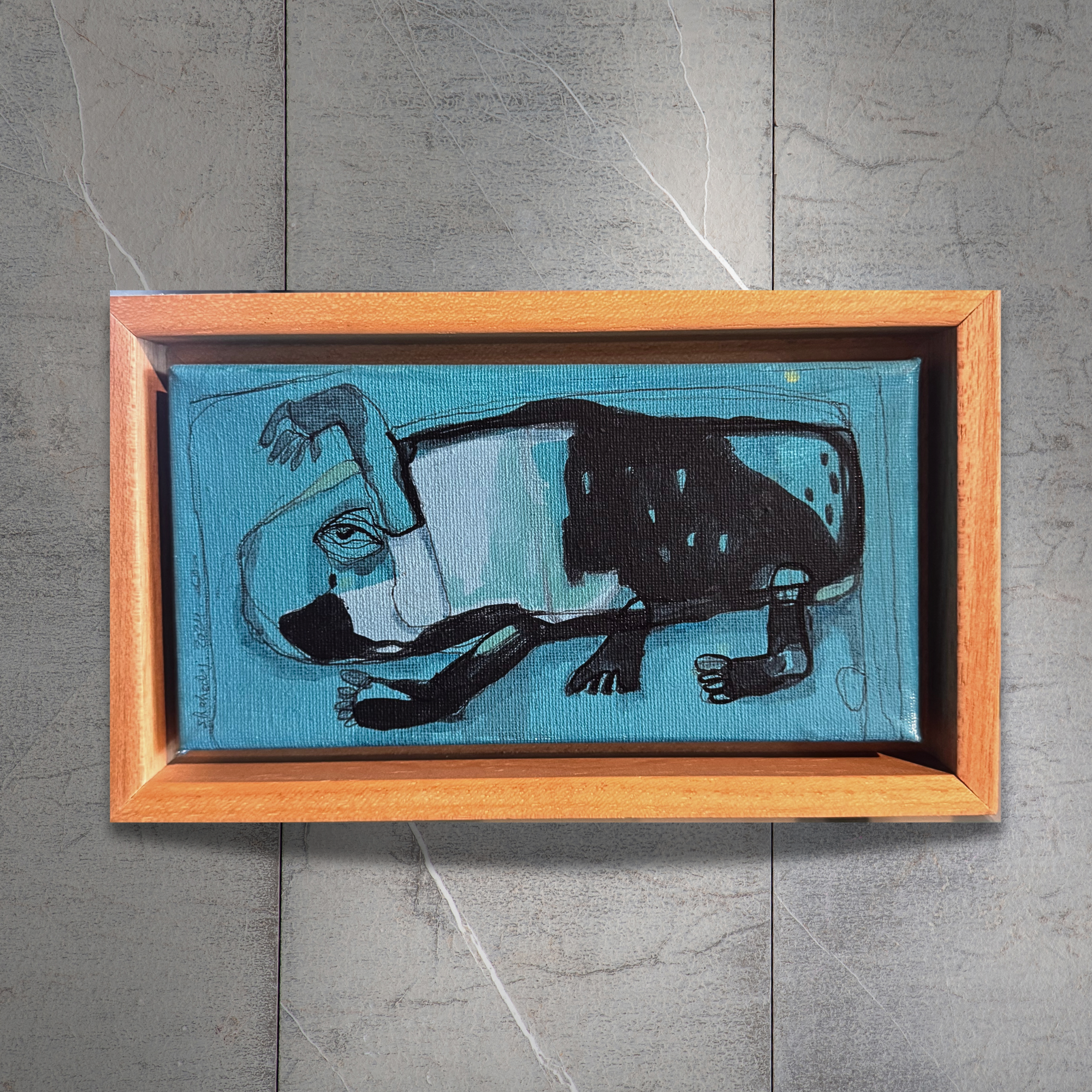 On a field of turquoise blue, a strange, reclining figure stretches across the canvas, part animal, part human, part dream. Its heavy-lidded eye suggests both weariness and watchfulness, a surreal body language that belongs to the world of neo-expressionism and outsider art. Each imperfect line feels intentional, charged with raw immediacy.