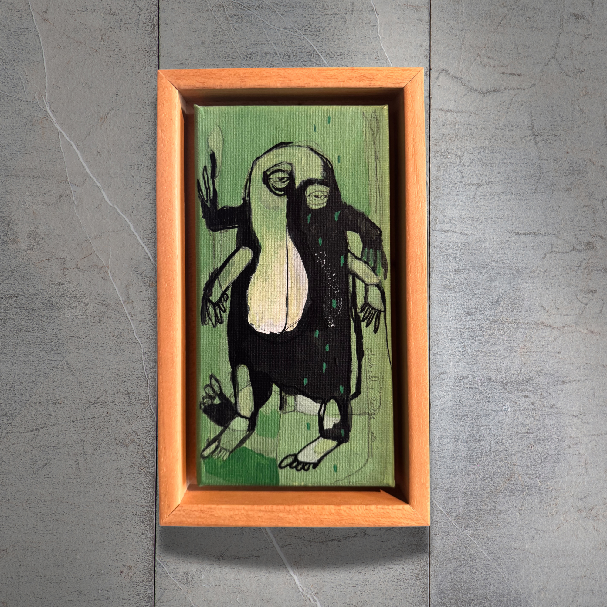 A whimsical figure emerges in bold black strokes, its form both playful and haunting. Set against shifting greens, the creature feels caught between humor and melancholy, echoing the raw freedom of neo-expressionism. The hand-drawn immediacy gives it the pulse of outsider art, a reminder of innocence and unease intertwined.