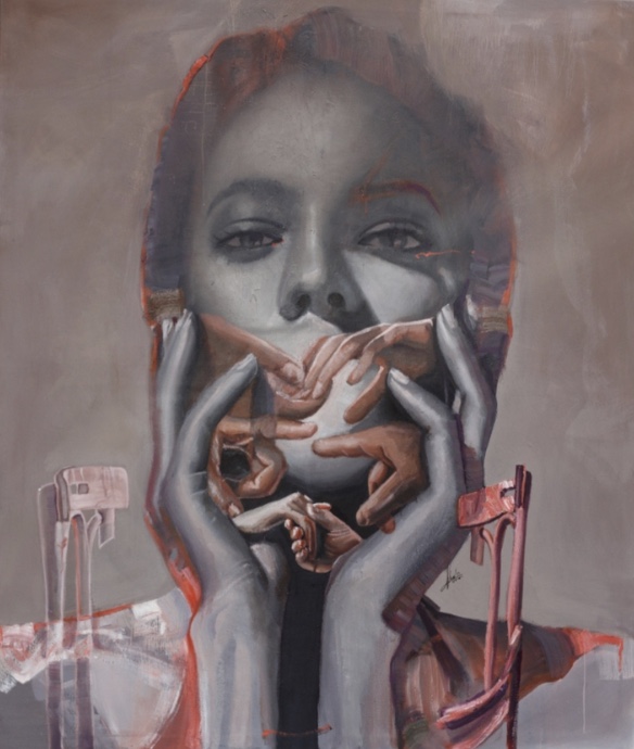 Ahmad Alwaari, a self-taught Syrian artist, blends realism with abstraction to bridge tradition and modernity. His iconic “Syrian chair” symbolizes resilience and power. In The Modern World, he explores the impact of digital transformation on human connection, reflecting on societal shifts with a signature coral and silver palette.