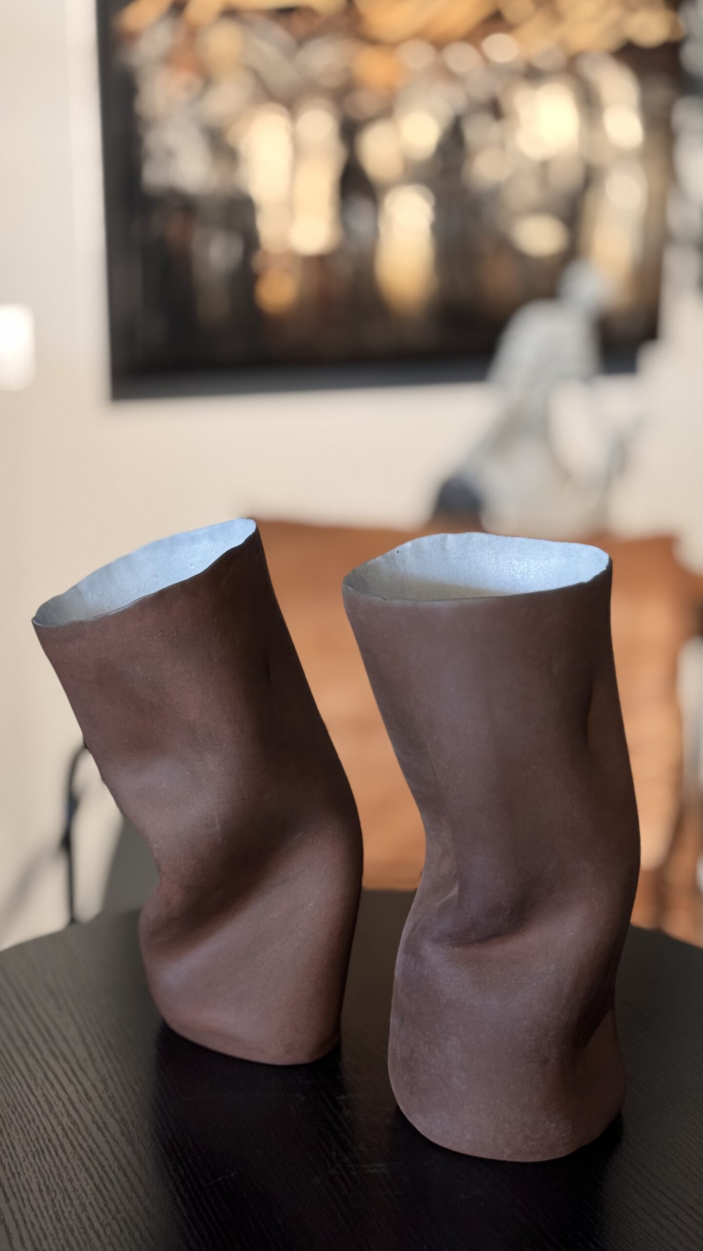 Each vase carries its own presence — one leans, the other listens, together they create a gentle dialogue of form. Whether standing alone or side by side, their curves whisper of intimacy, balance, and the beauty of imperfection. Hand-sculpted ceramic, glazed in Terracotta and White.