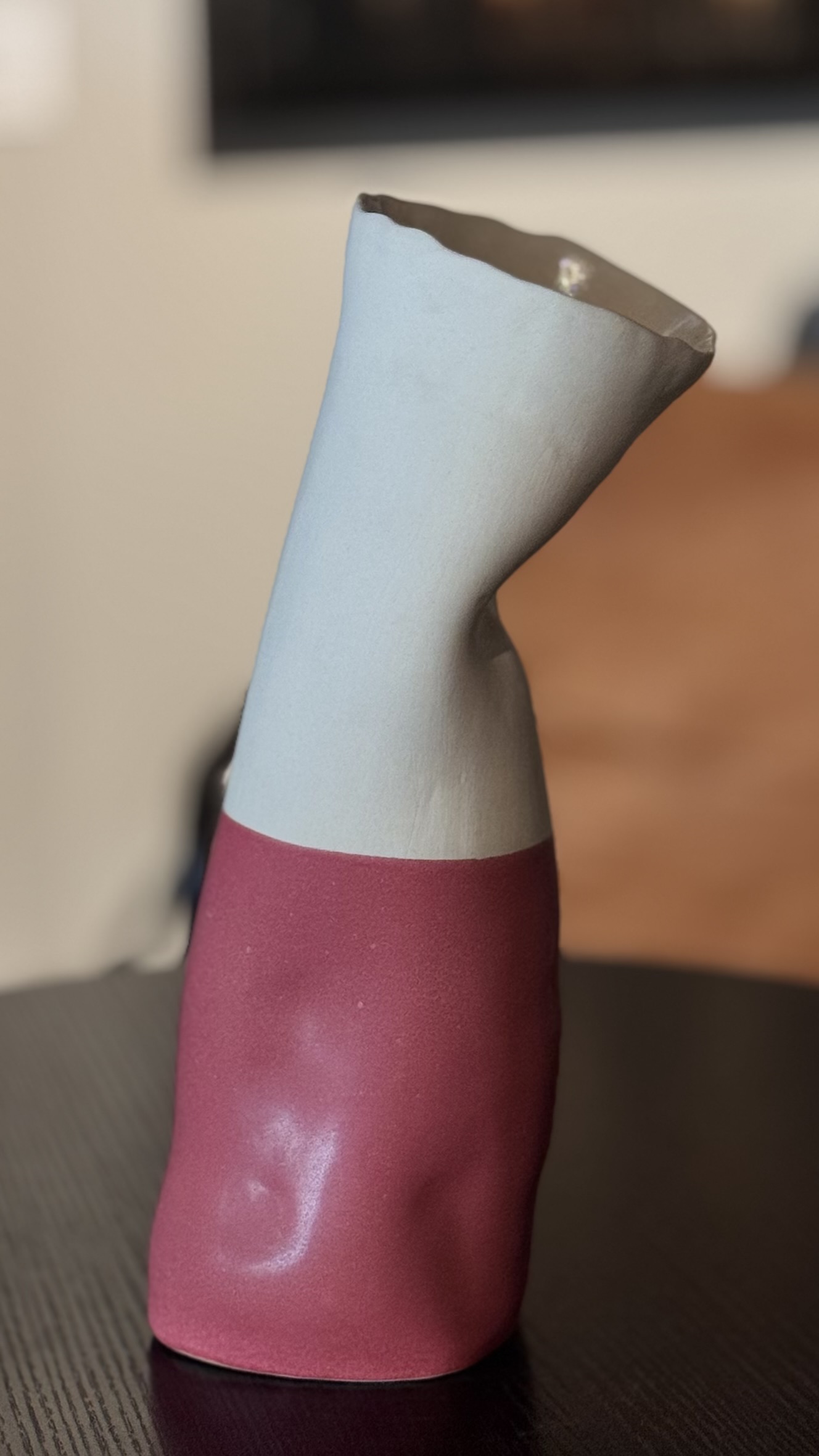 Each vase carries its own presence — one leans, the other listens, together they create a gentle dialogue of form. Whether standing alone or side by side, their curves whisper of intimacy, balance, and the beauty of imperfection. Hand-sculpted ceramic, glazed in white and red.