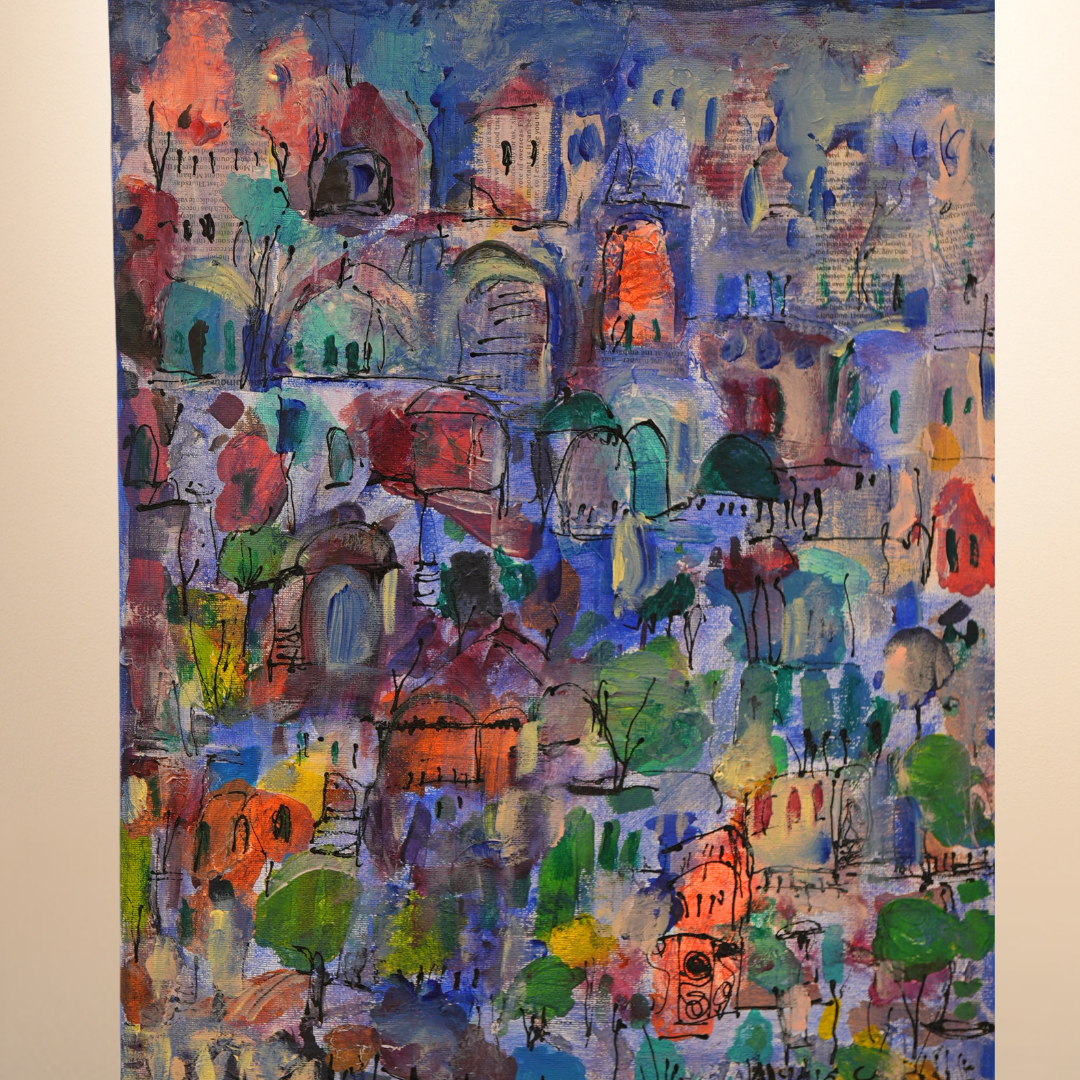 “Walls & Stories” by Etab Hreib is an acrylic on canvas alive with fragments of memory and imagination. Hints of houses, arches, and trees overlap in layers of blue, green, and crimson — like a city built from recollection rather than stone. Every brushstroke feels like a whisper of life once lived: laughter behind windows, voices echoing through narrow streets. Hreib turns architecture into emotion, showing how walls don’t just contain stories — they become them.