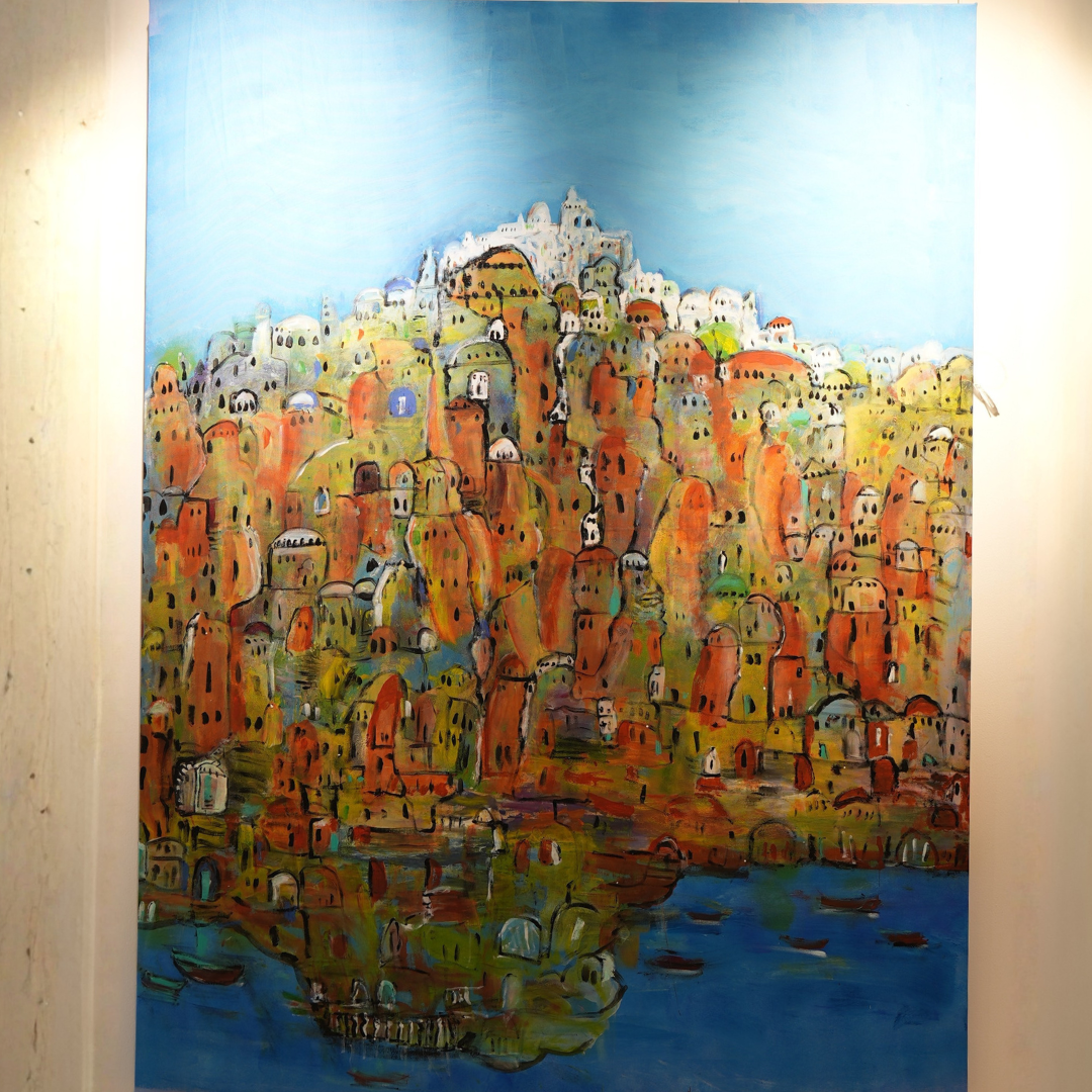 “White Temple Path” by Etab Hreib is an acrylic on canvas that unfolds like a vision, a city rising toward light. Terracotta homes climb a sunlit hill, leading the eye to a crown of white domes glowing against the sky. The ascent feels spiritual, a quiet pilgrimage from earth to clarity.Hreib paints the idea of transcendence, how belonging and faith are built step by step, house by house, memory by memory. The blues below anchor the work in reality, while the summit dissolves into something almost divine.