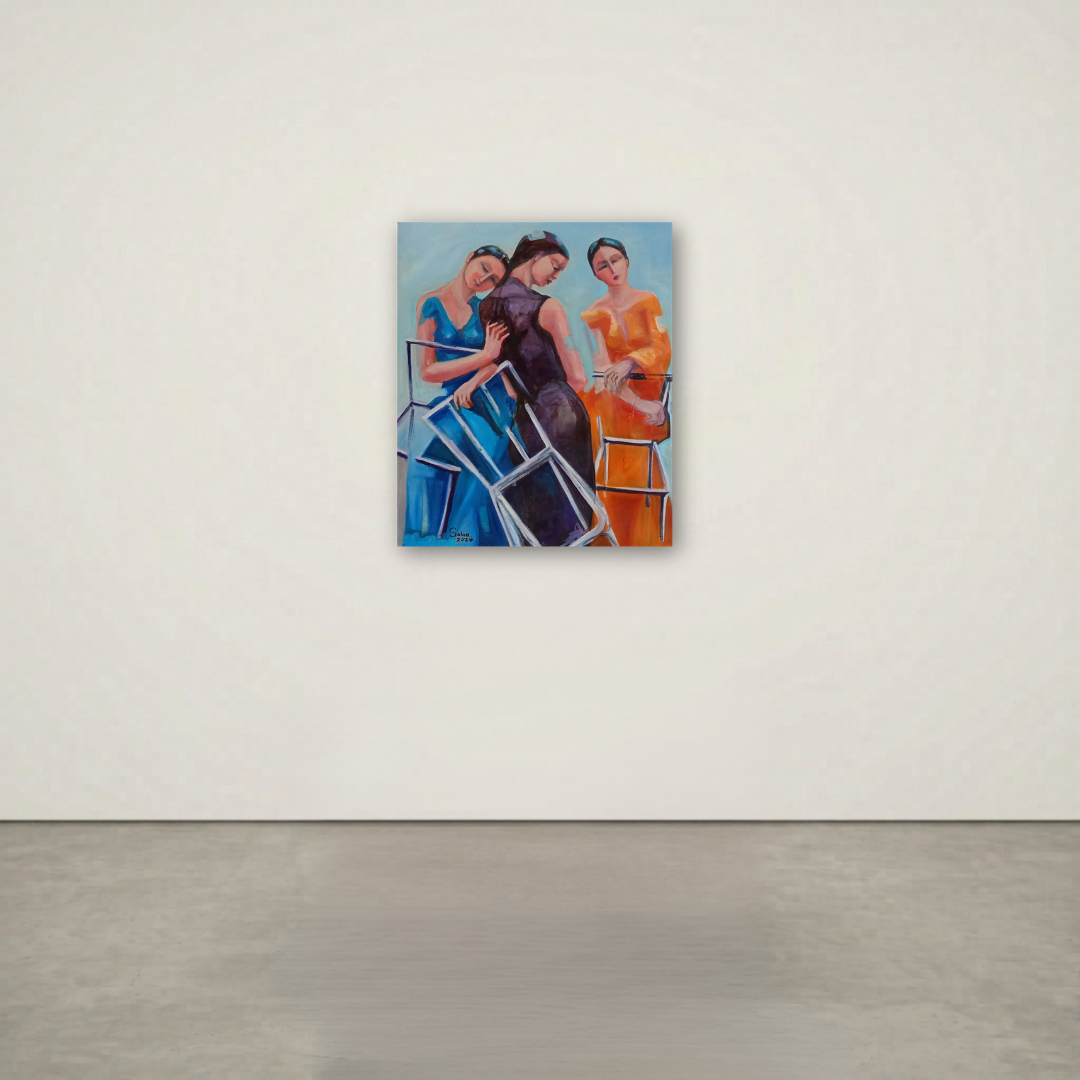 This work stages the figure within a subtle emotional drama, where posture and proximity suggest a shared yet unspoken tension. The three figures lean into one another, yet remain psychologically distant—connected in form, separated in feeling.